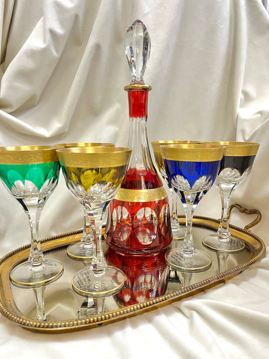 Spalvoto krištolo taurių ir grafino rinkinys su reljefiniu auksavimu