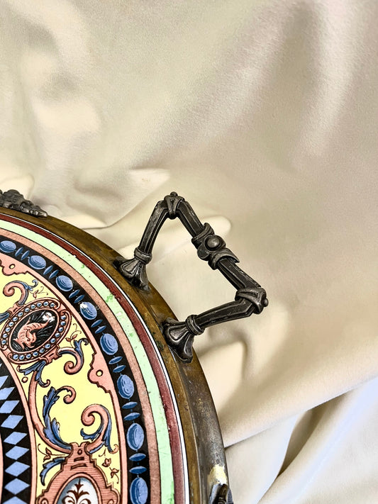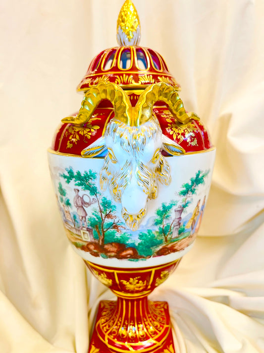 Rankomis dekoruota porcelianinė vaza su avinų galvomis