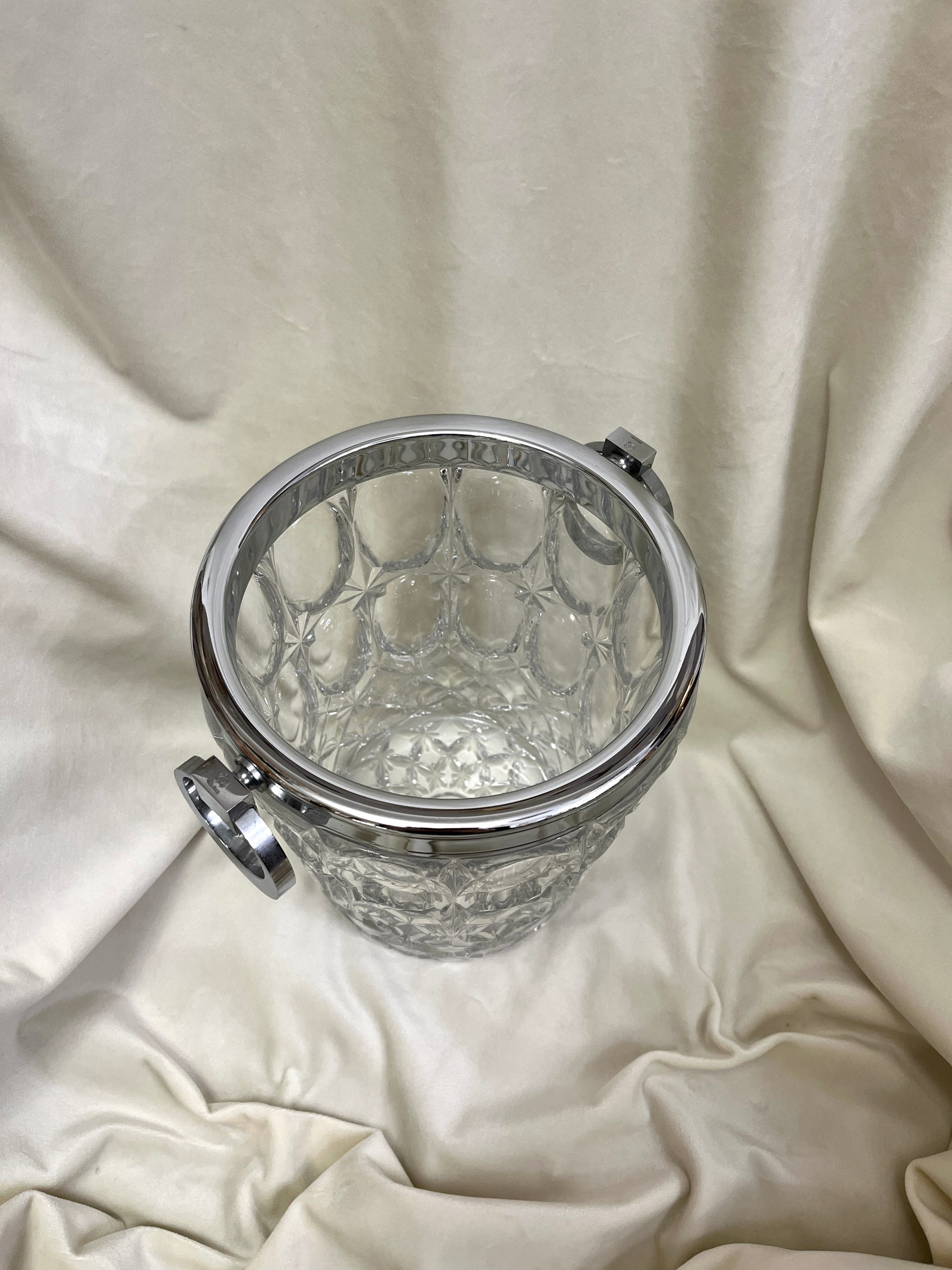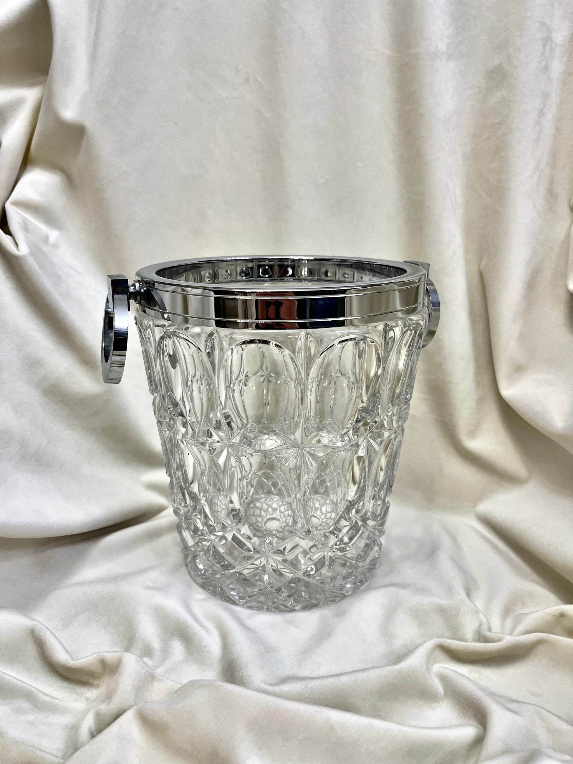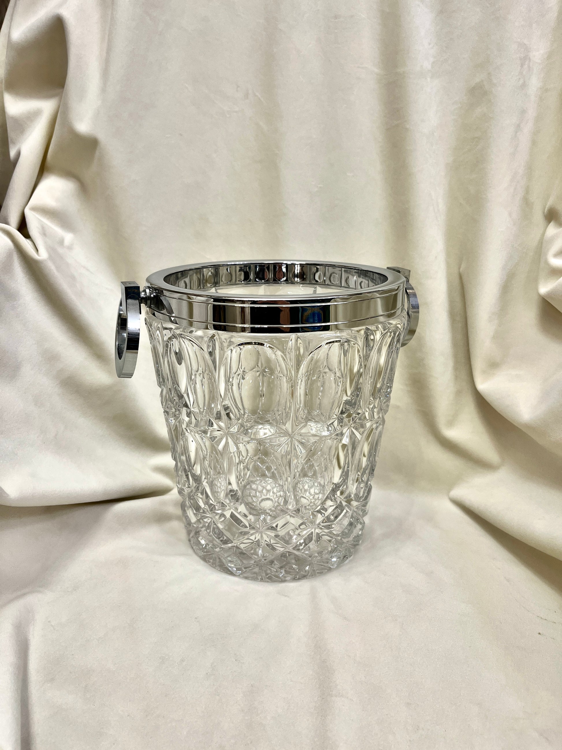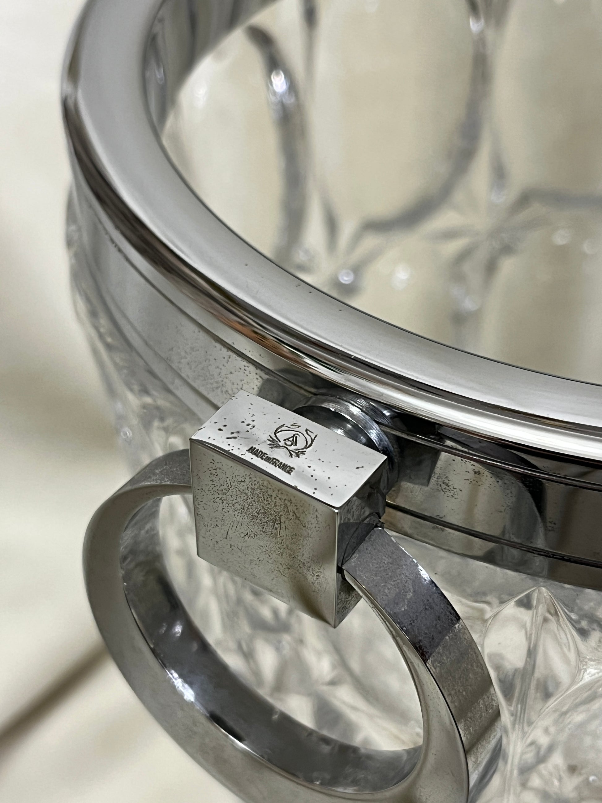 Šį stulbinantį modernistinį Art Deco stiliaus chromo ir krištolo šampano šaldytuvą prancūzų sidabrakalys Alois Straszak sukūrė „Argenterie Le Crabe“ dirbtuvėse 1940-aisiais. Prabangus ir elegantiškas dizainas pasižymi masyviu krištolo indu bei poliruoto chromo rėmu su rankenomis, o pats krištolas yra dekoruotas sudėtingais, raižytais geometriniais raštais. Šis baro aksesuaras puikiai tinka šampano ar vyno buteliams vėsinti, o jo autentiškumą patvirtina ant rankenų apačios esantis originalus įmonės spaudas – monograma A.S. su krabo logotipu ir užrašu „Made in France“.
