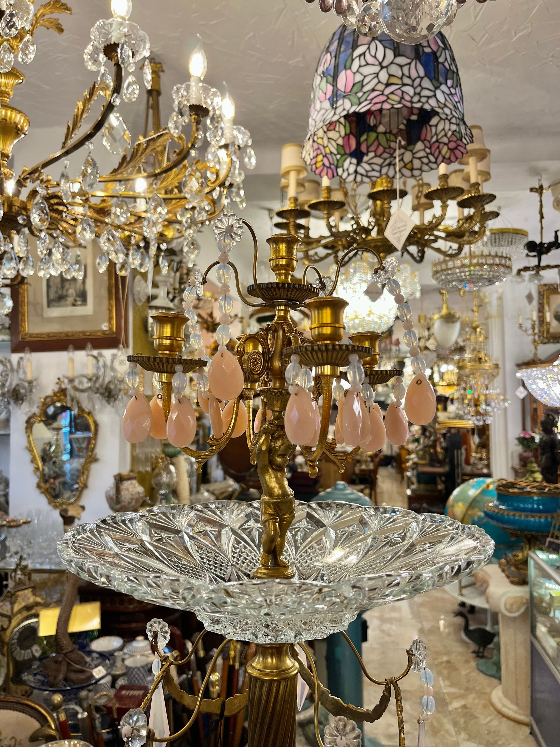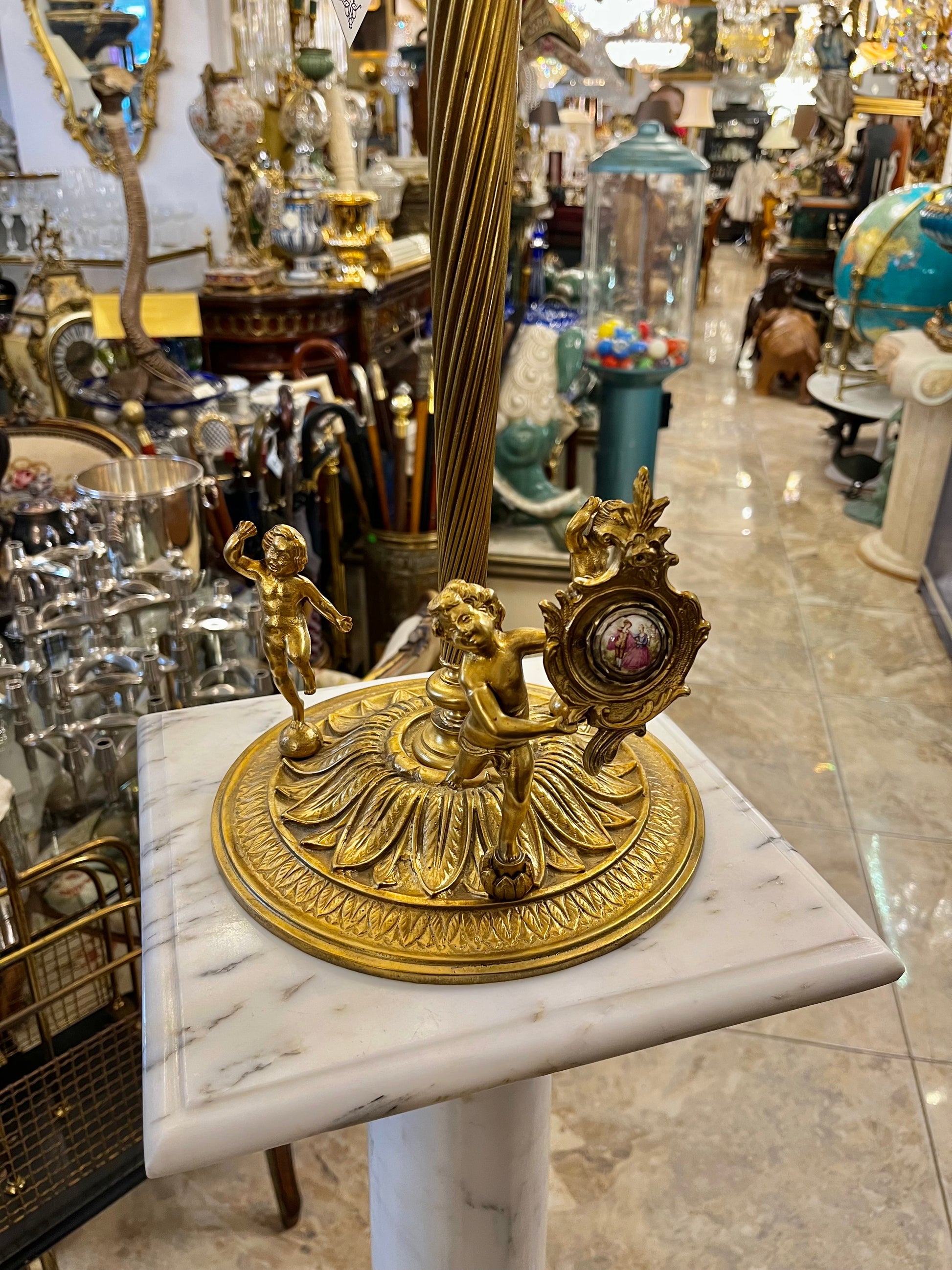 Išskirtinio grožio ir meistriškumo žalvarinė žvakidė, puošta trimis cherubinais apačioje, subtiliai laikančiais porceliano medalį su Fragonard motyvais – elegantiška duoklė prancūziškam rokoko stiliui, bei vienu viršuje laikančiu žvakidę.