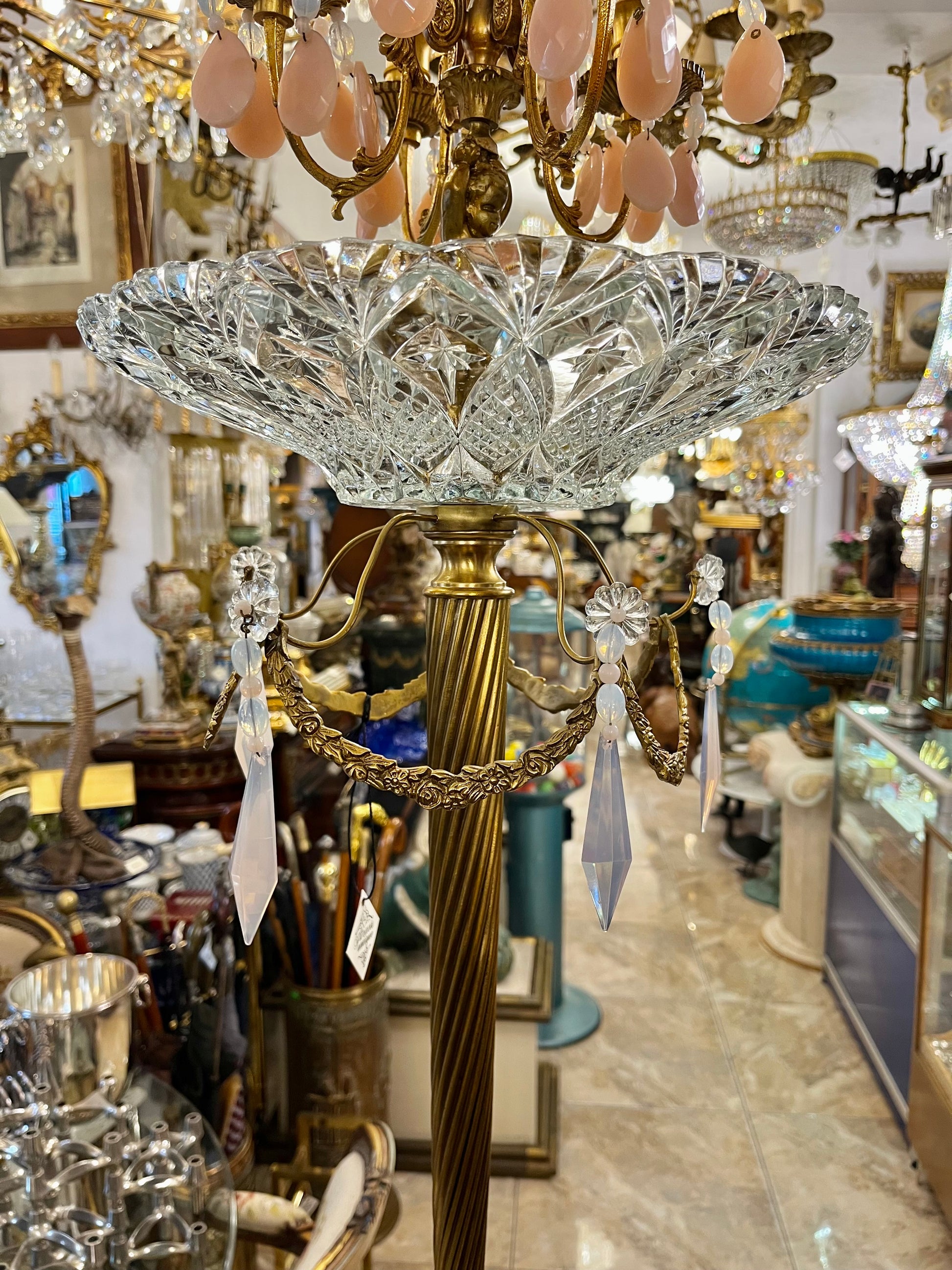 Viršuje – krištolo lėkštė, suteikianti kompozicijai lengvumo ir šviesos žaismą, o aukštas (85 cm) žalvario stiebas pabrėžia jos kilnumą bei išskirtinumą.