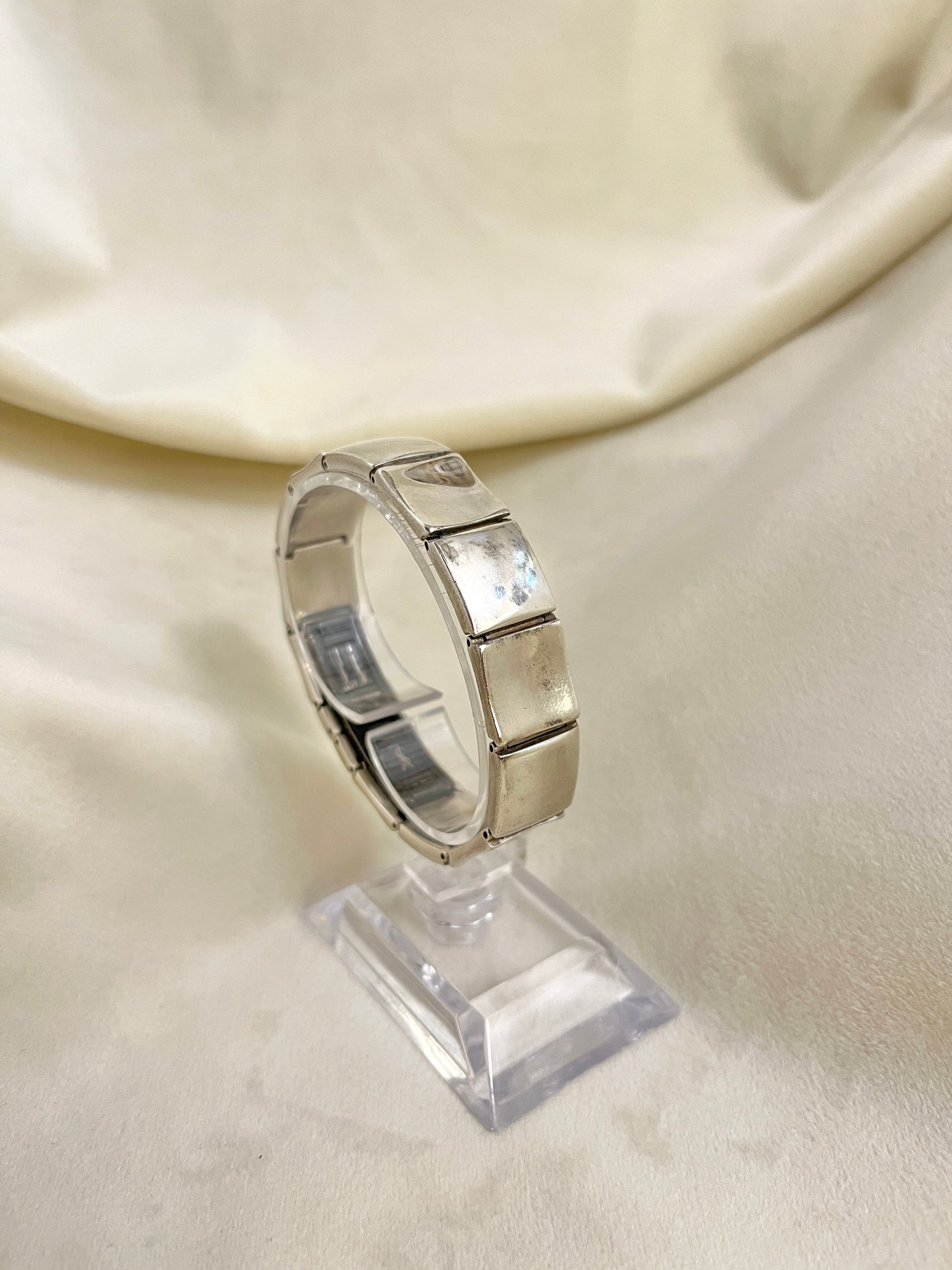 Stilinga ir minimalistinė „Yves Saint Laurent“ (YSL) apyrankė, skirta vertinantiems modernią klasiką. Papuošalas išsiskiria švariomis linijomis, tvirta segmentine konstrukcija bei subtilia prekės ženklo simbolika ant užsegimo.