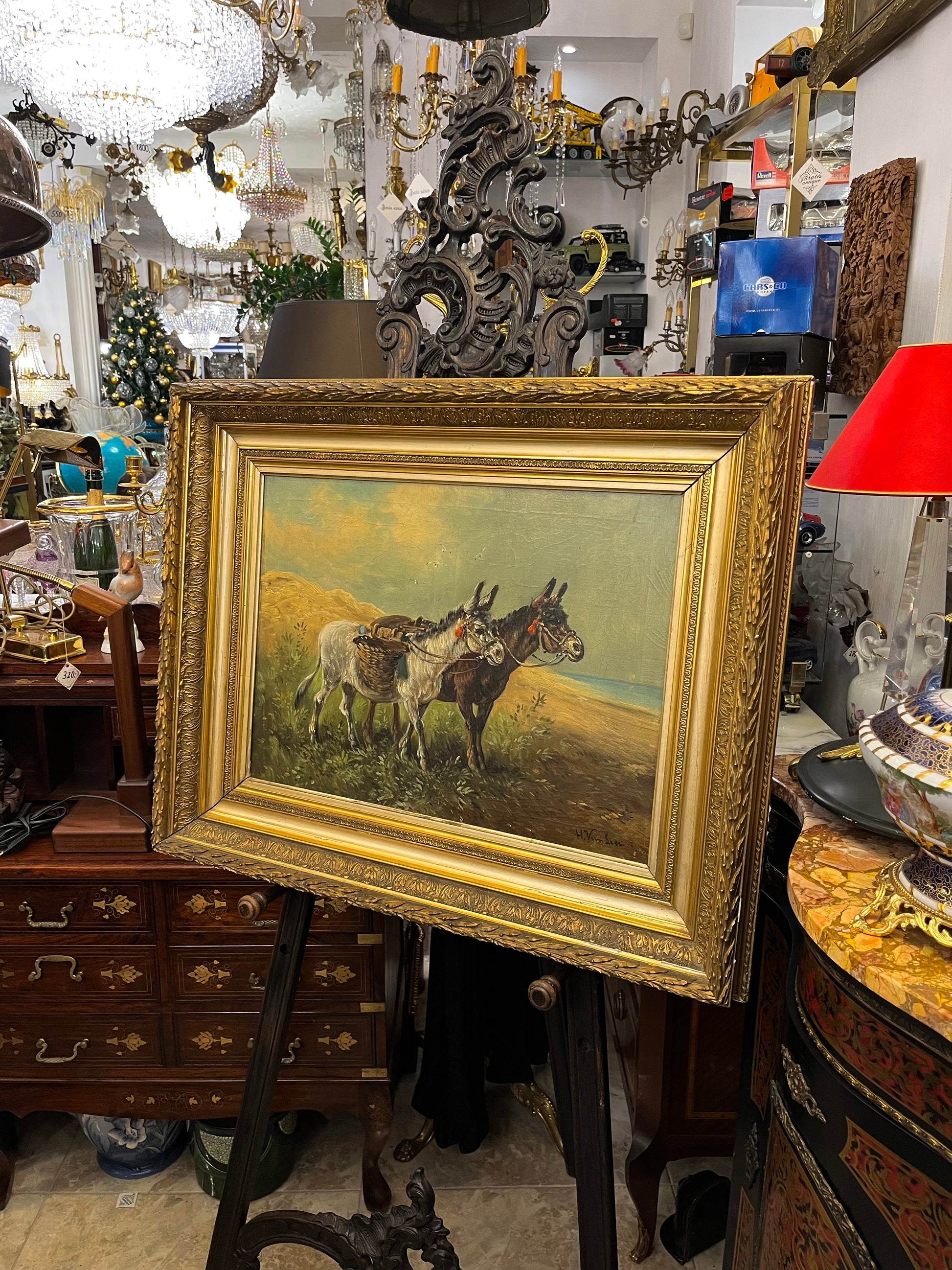 spūdingas kūrinys (85cm x 69cm), nutapytas aliejiniais dažais, papildytas masyviu, dekoruotu auksiniu rėmu. Šiltas kraštovaizdis, ramybės kupinas fonas ir du keliautojai asilai sukuria istorijos pojūtį – tarsi akimirka sustabdyta laike.