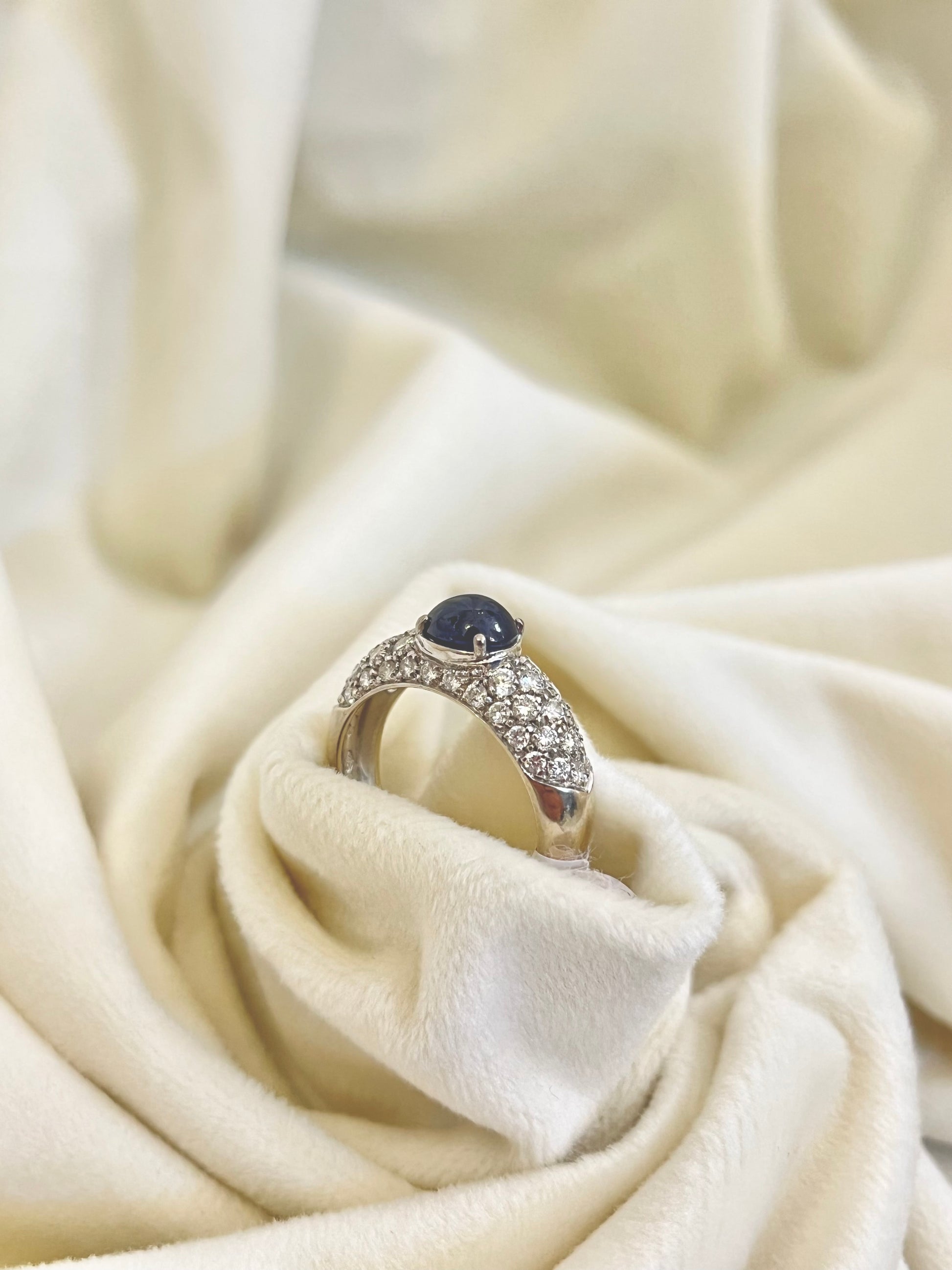 Išskirtinis, rankų darbo žiedas, sukurtas subtiliai prabangai ir rafinuotam skoniui. Žiedo centre – įspūdingas 2,05 ct dydžio kabušoninis safyras. Jį iš visų pusių juosia spindintys deimantai, bendro svorio net 0,9 ct, sukuriantys ypatingą šviesos žaismą ir dar labiau išryškinantys pagrindinį akmenį.