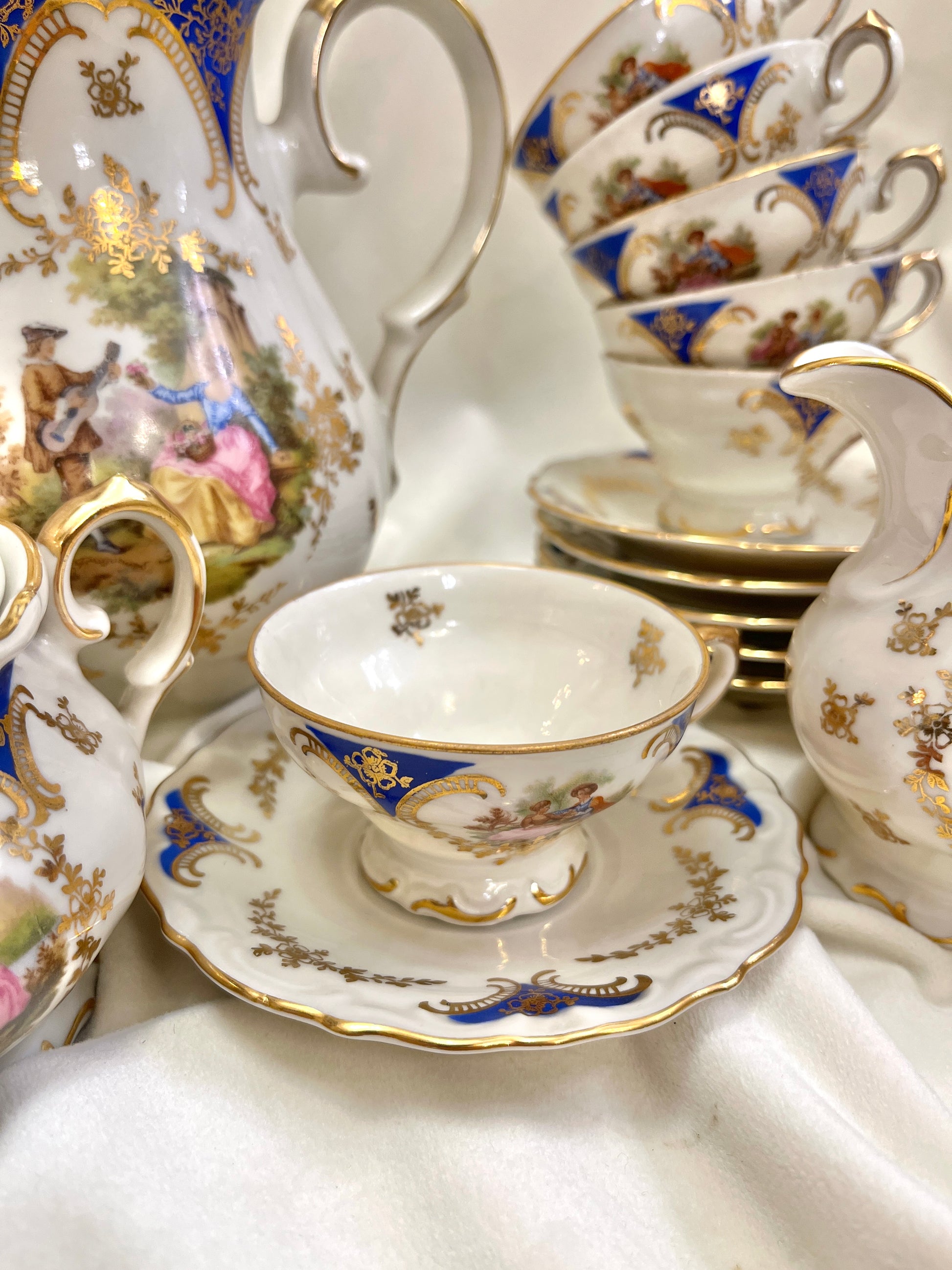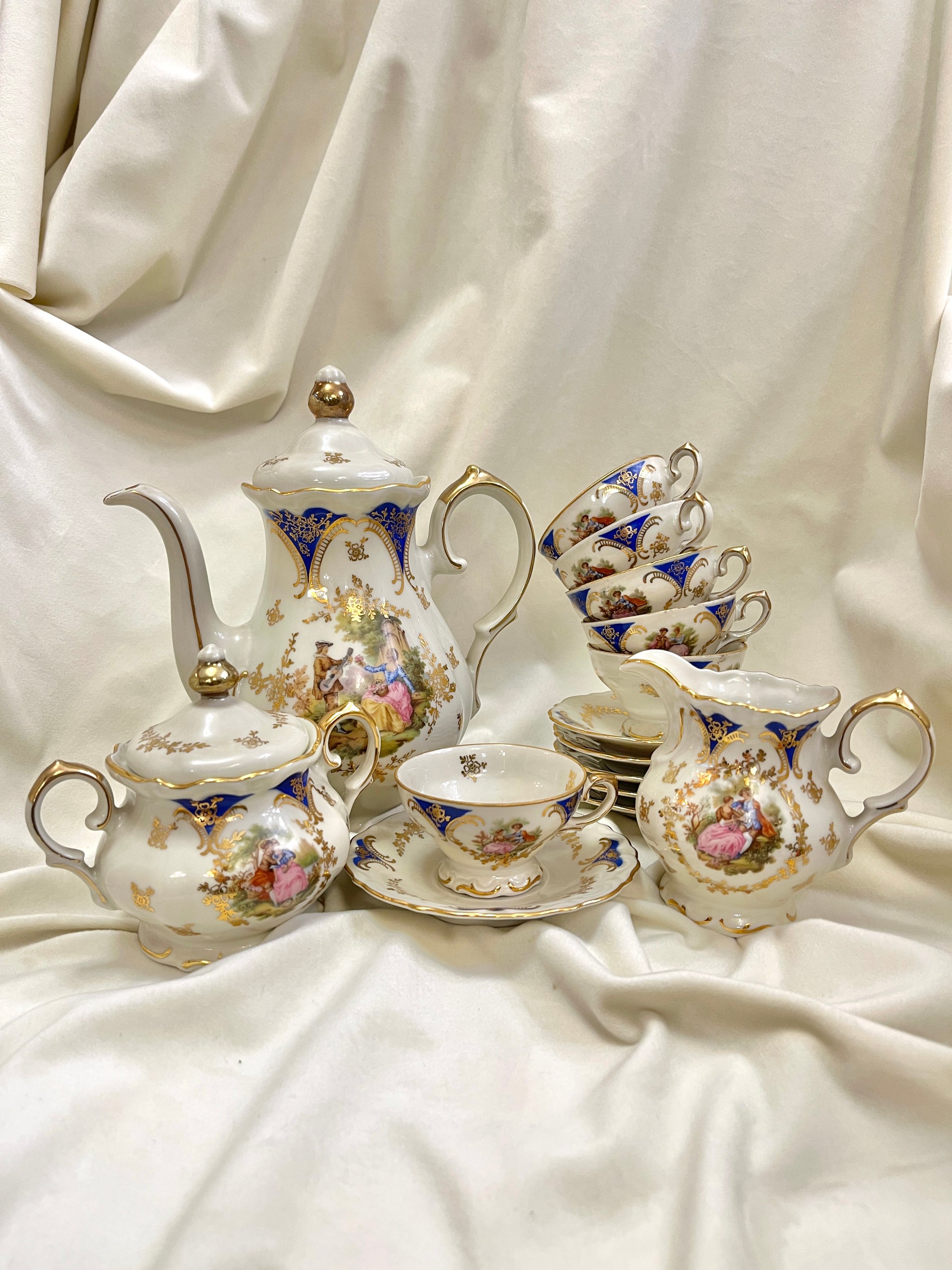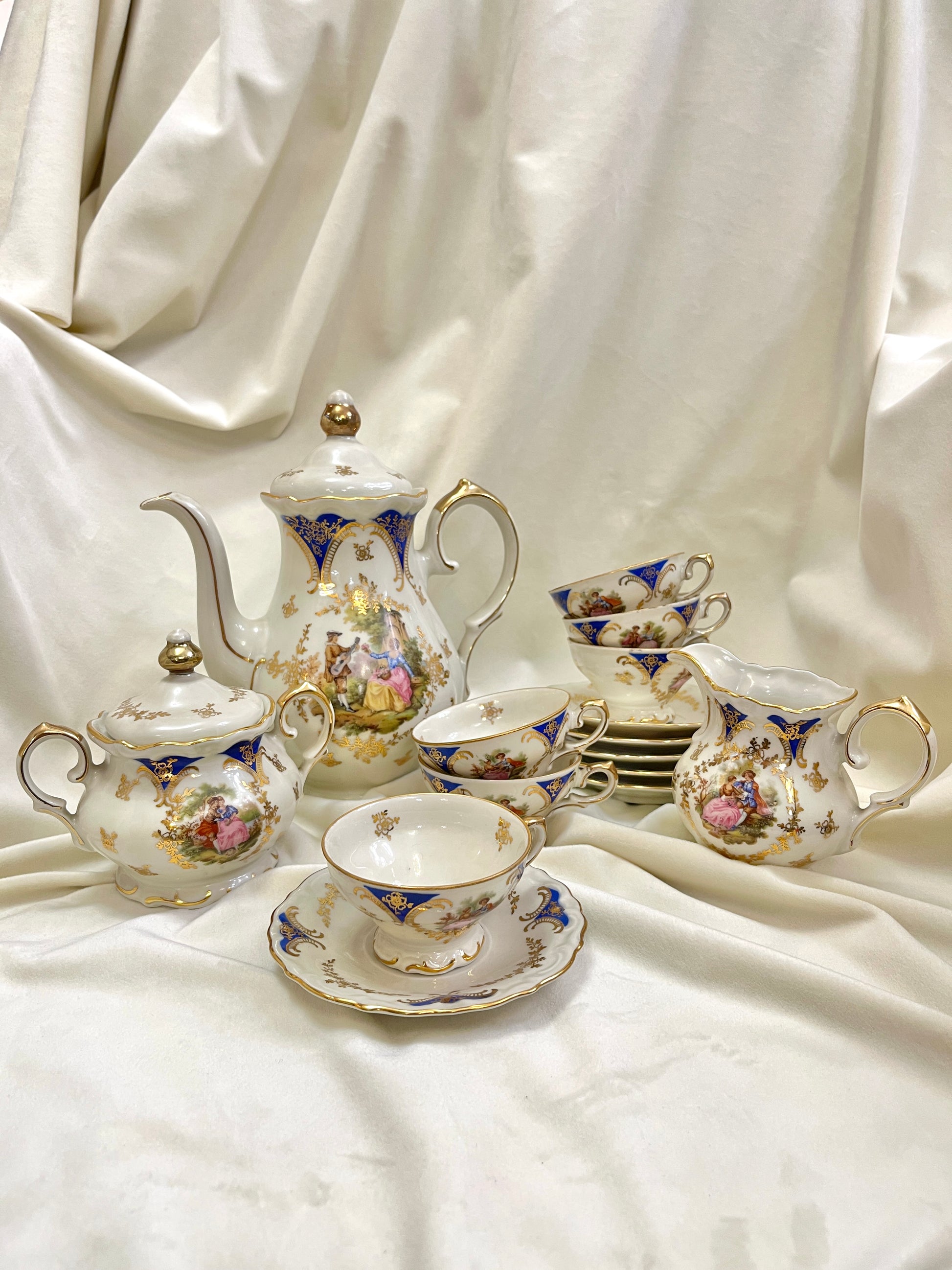 bavaria porceliano kavos ar arbatos rinkinukas dekoruotas auksu bei fragonard motyvais. Komplekta 6 vnt. Puodelių su lėkštelėmis, arbatinukas, cukrinė ir grietinėlės indas. Puodeliai nedideli (100ml~)