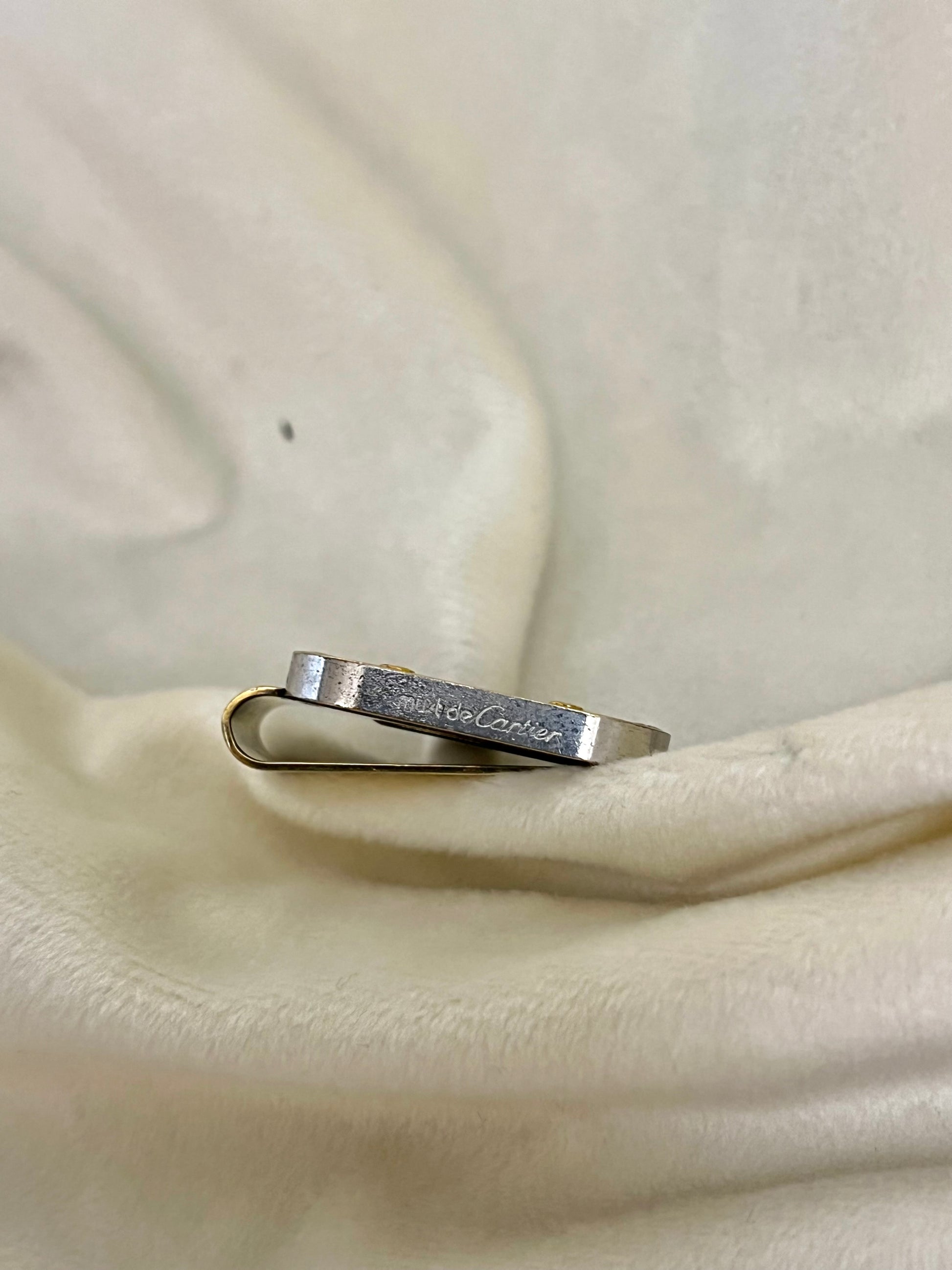 Išskirtinio dizaino Cartier pinigų segtukas iš legendinės „Must de Cartier“ linijos – subtilus prabangos ir praktiškumo derinys. Pagamintas iš dviejų tonų metalo – paauksuoto ir sidabro spalvos paviršiaus, dekoruotas ikonišku Cartier monograminiu logotipu.