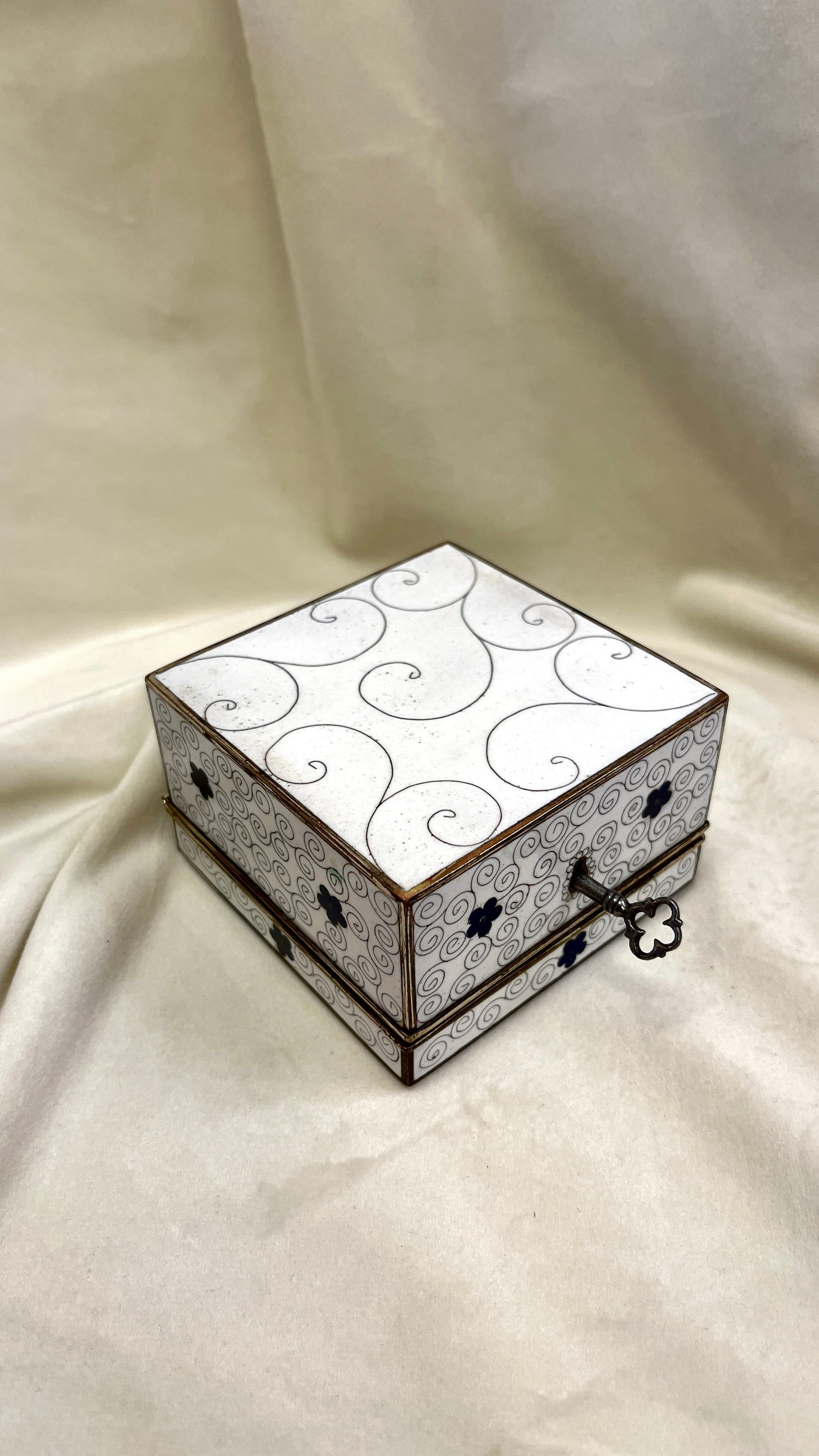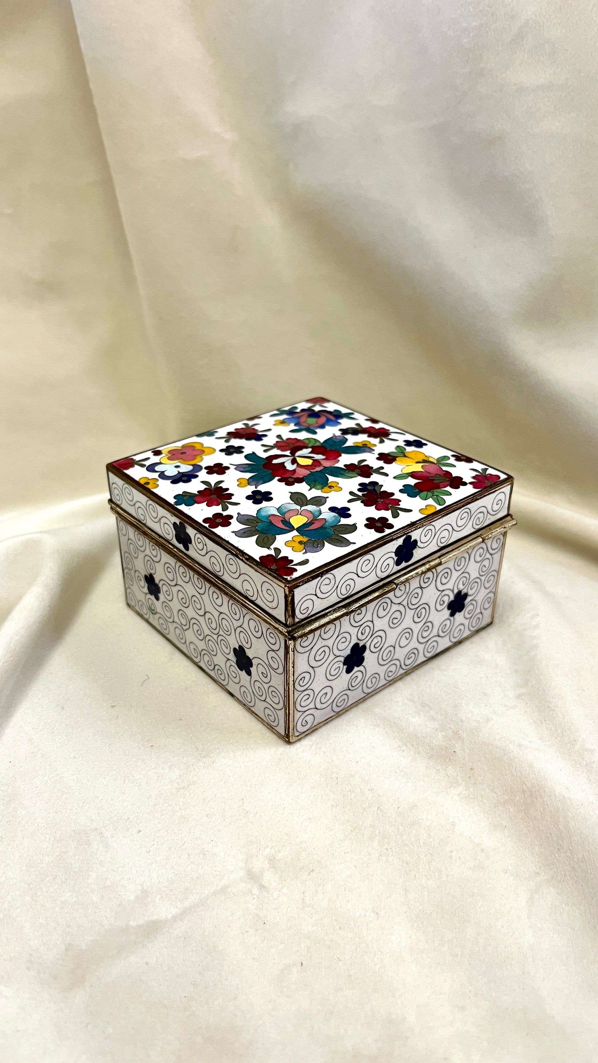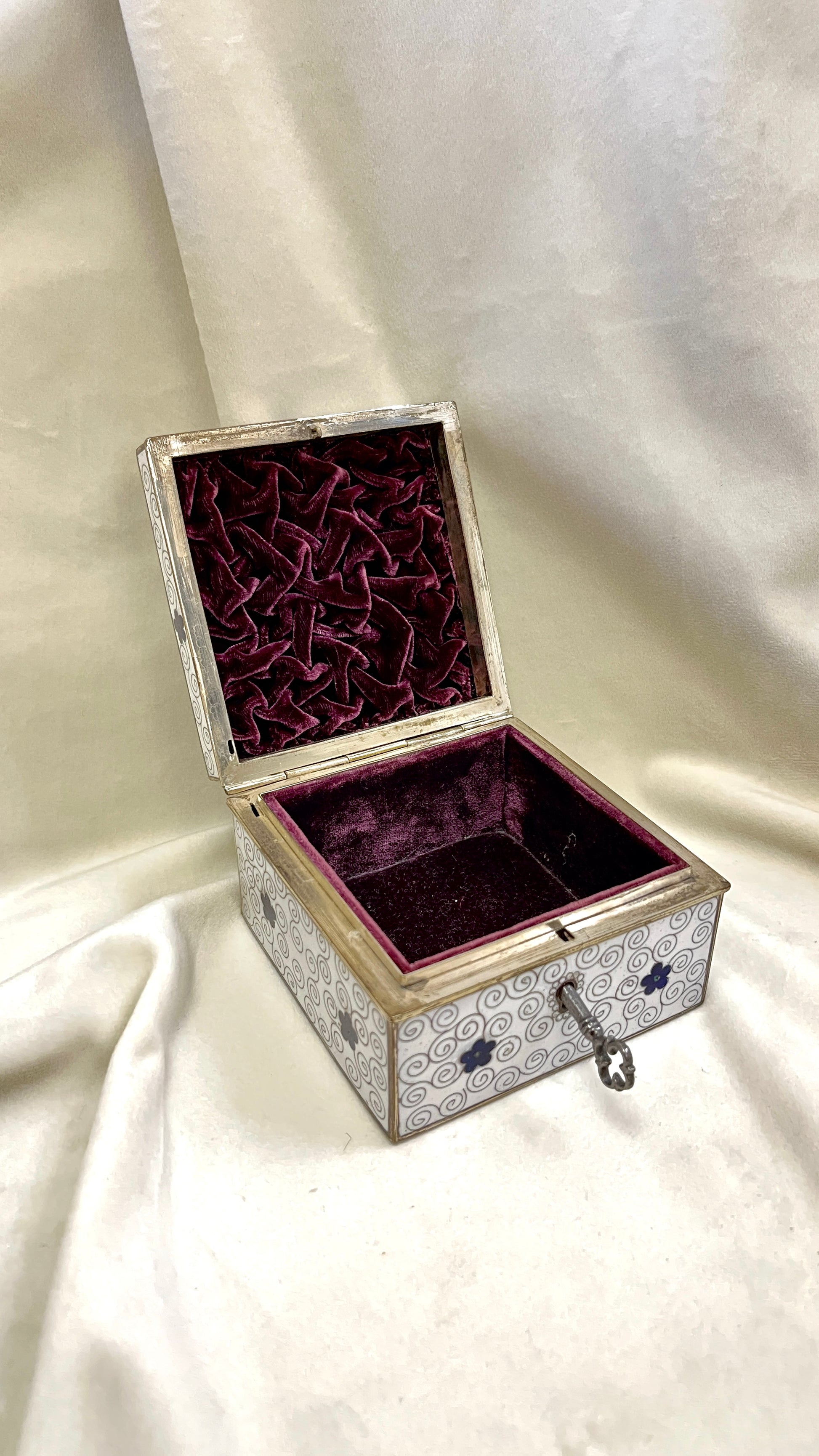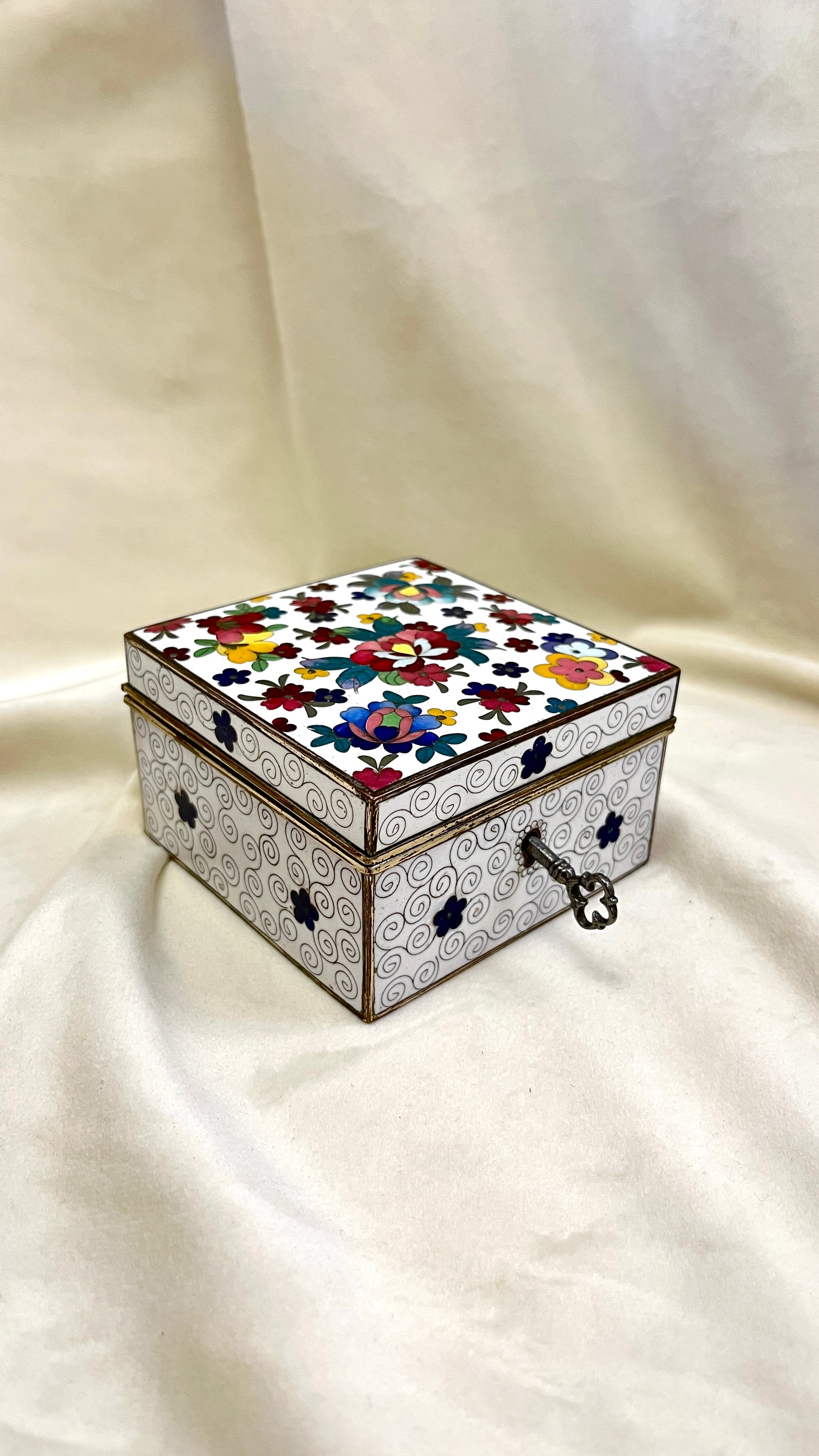 Floristikos motyvais puošta Japoniška Cloisonne emale dengta papuošalu dėžutė papuošalamas, dengta medžiaga viduje, bei rakinama.