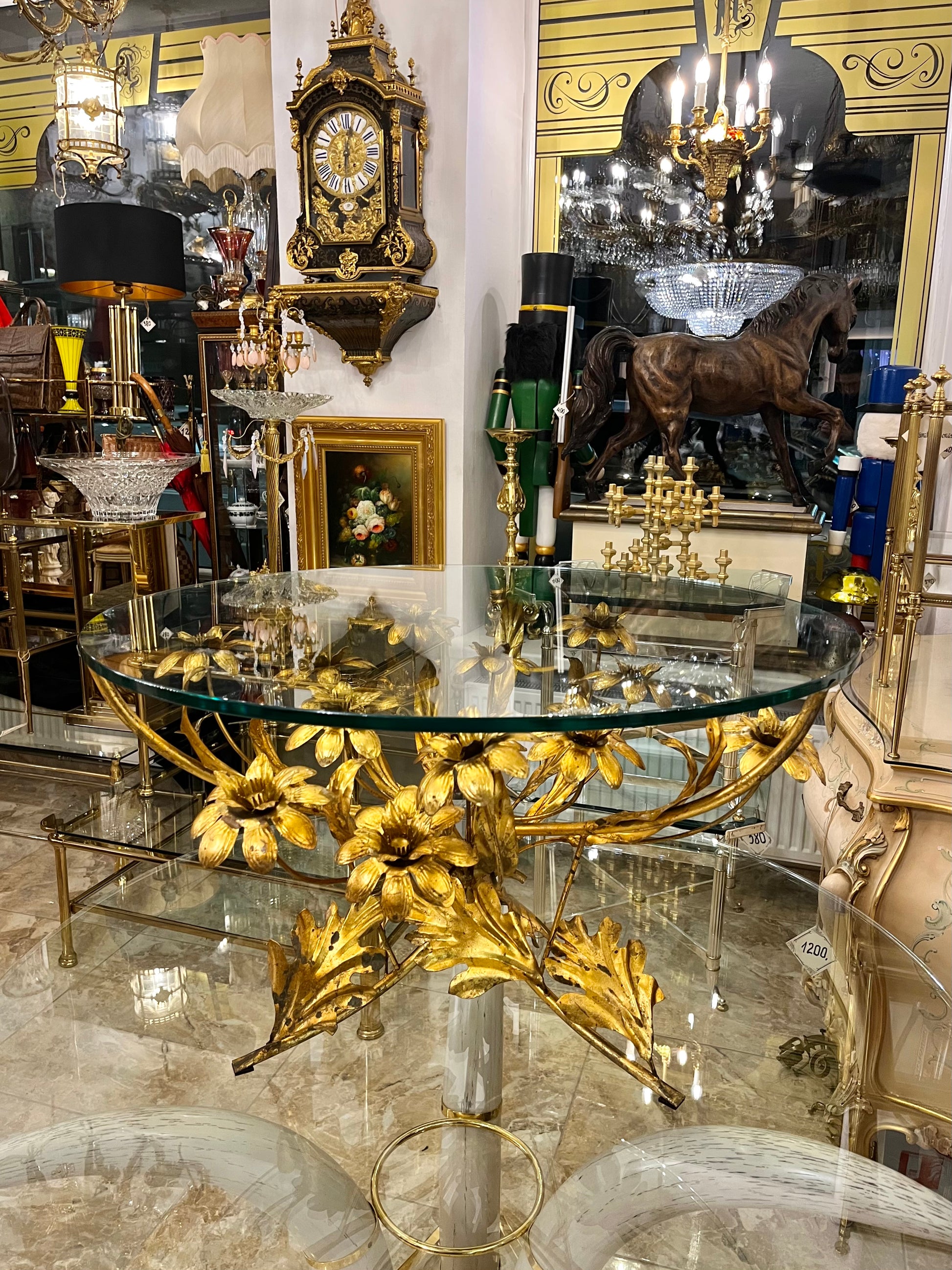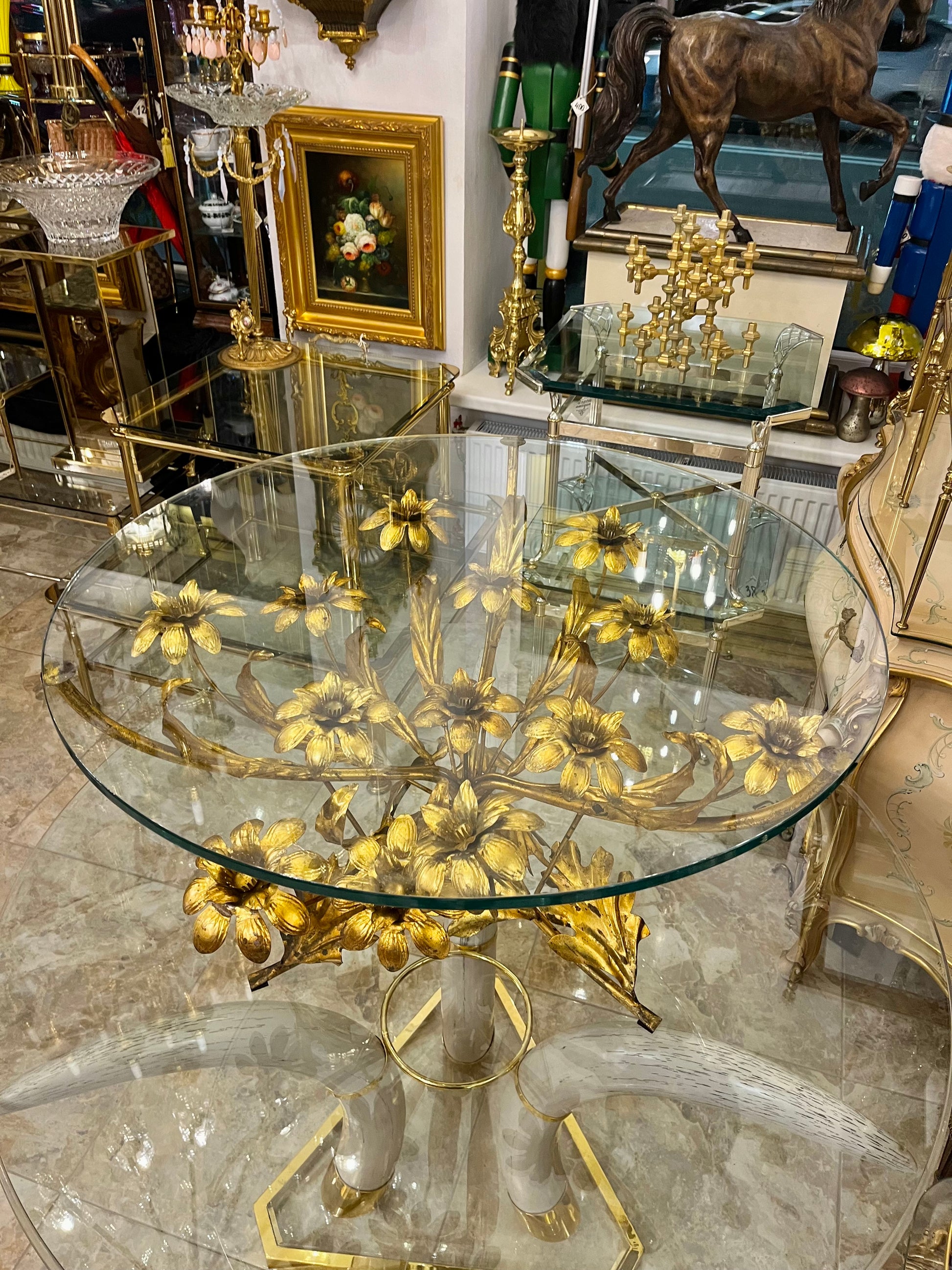 Centrinė kompozicija, primenanti žydinčių gėlių puokštę, įrėminta į skaidraus stiklo paviršių, sukuria lengvumo ir rafinuoto žavesio įspūdį. Tai vienas atpažįstamiausių Hans Kögl dizaino elementų – gėlių motyvai, išlieti metale ir dengti švelniu auksiniu tonu, subtiliai atspindinčiu šviesą.