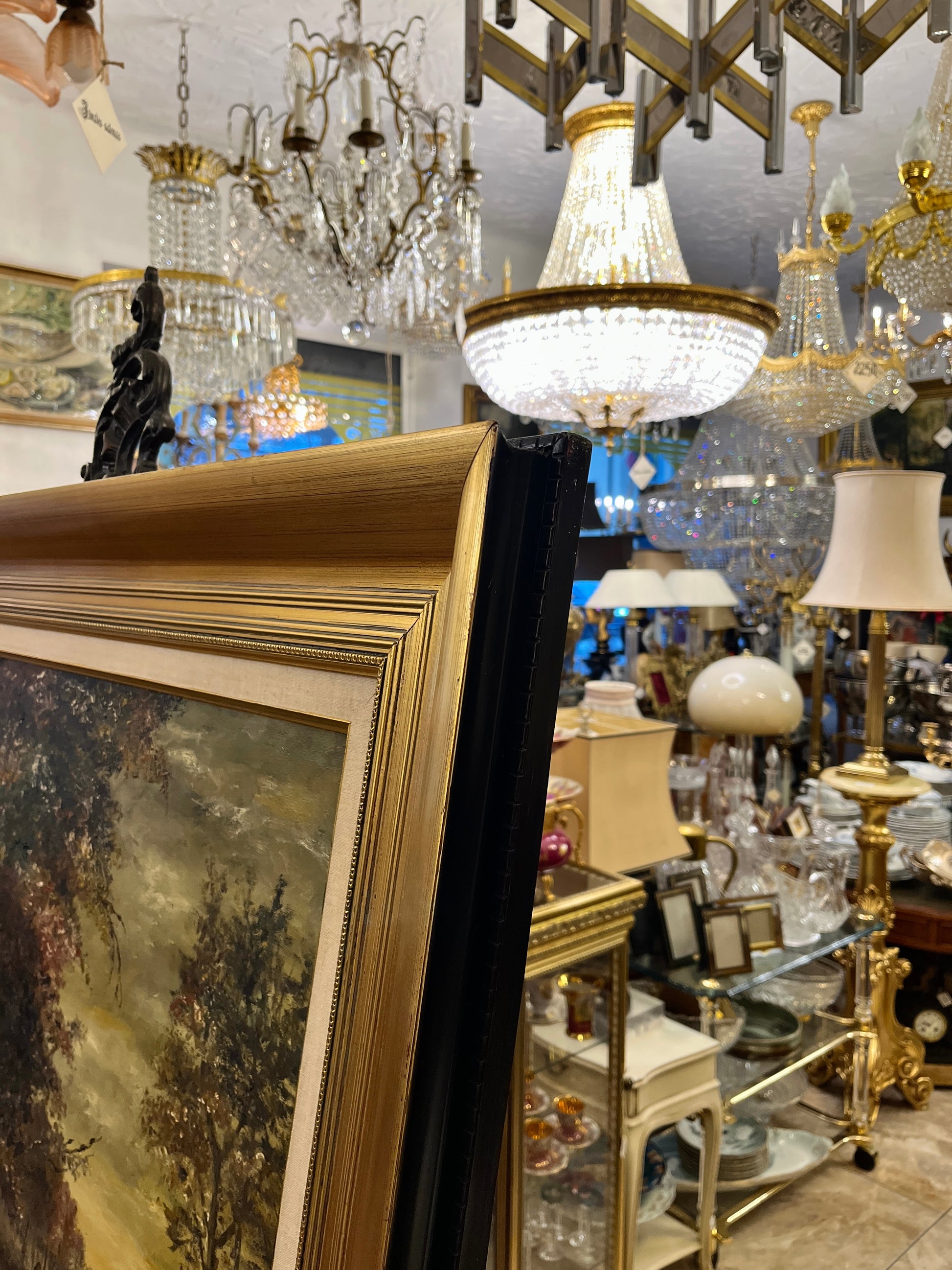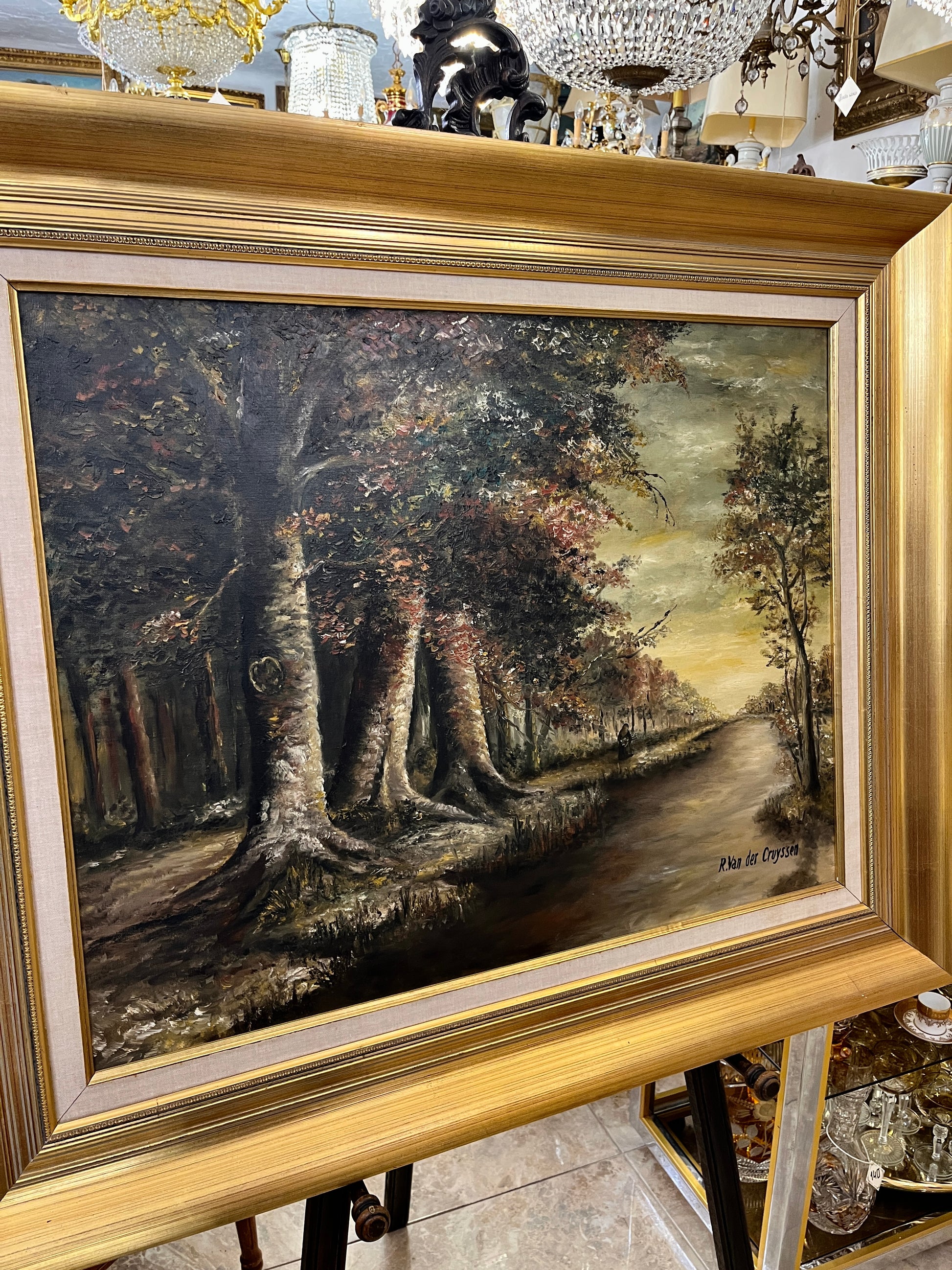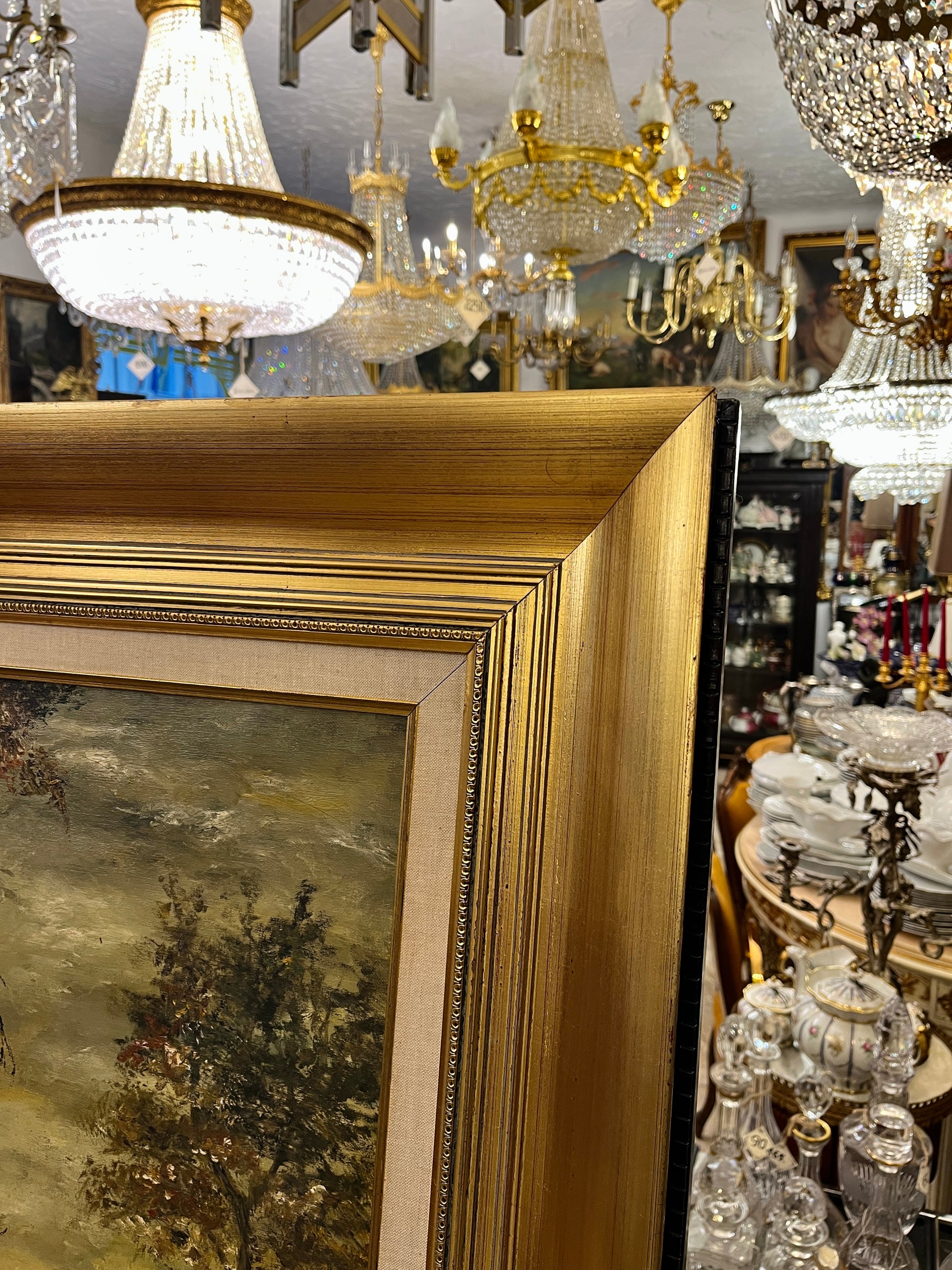 Masyvus gamtos peizažas - solidus akcentas, pasižymintis ramybe ir klasikine estetika. Kūrinys nutapytas aliejumi ant drobės, o jo kompoziciją užbaigia puošnus auksuotas medinis rėmas su juodos spalvos kraštu.