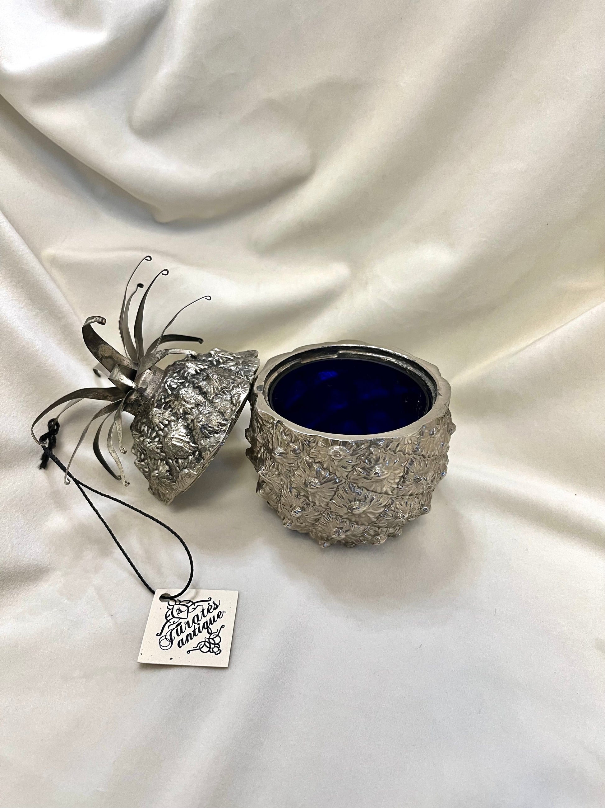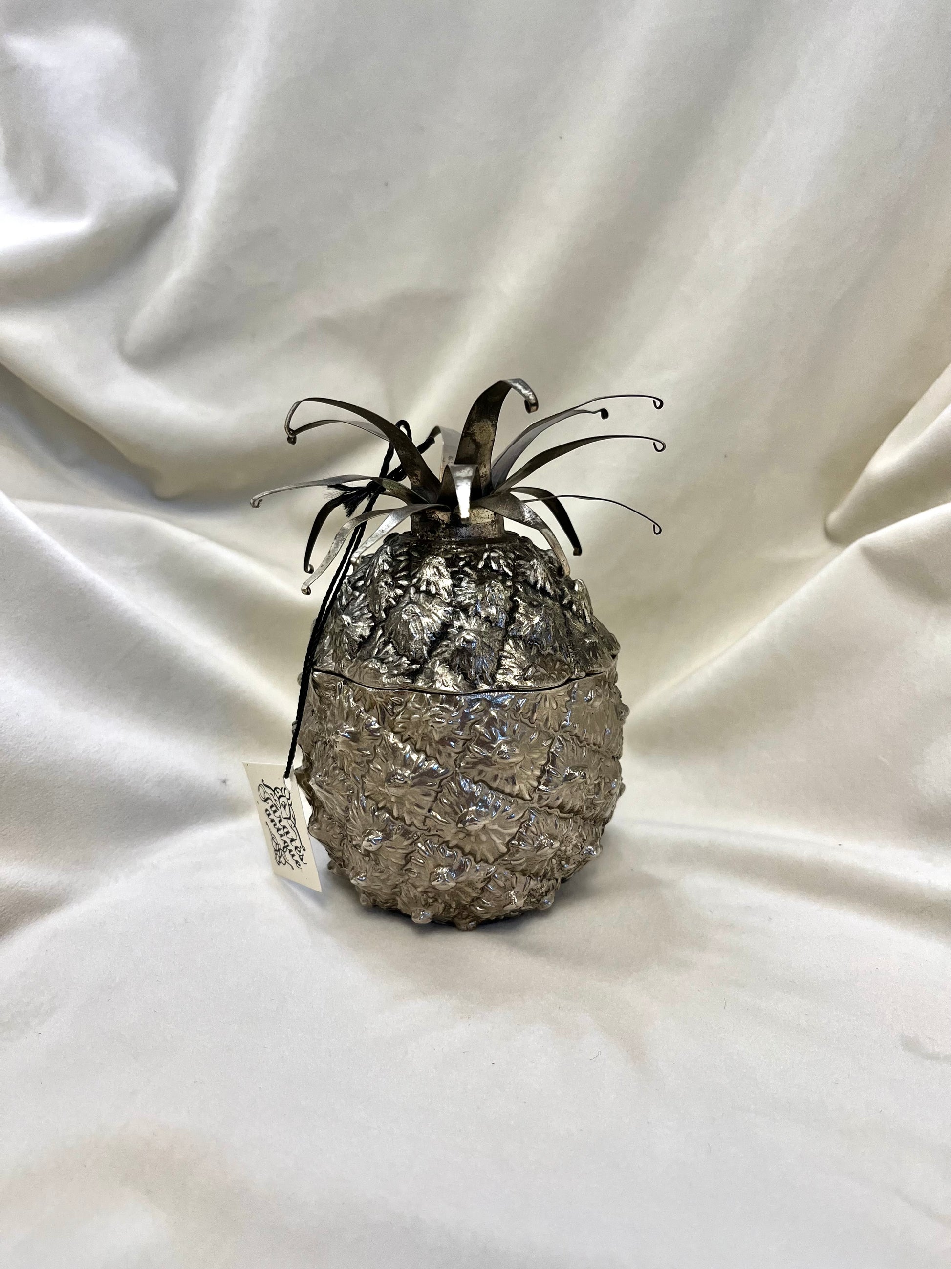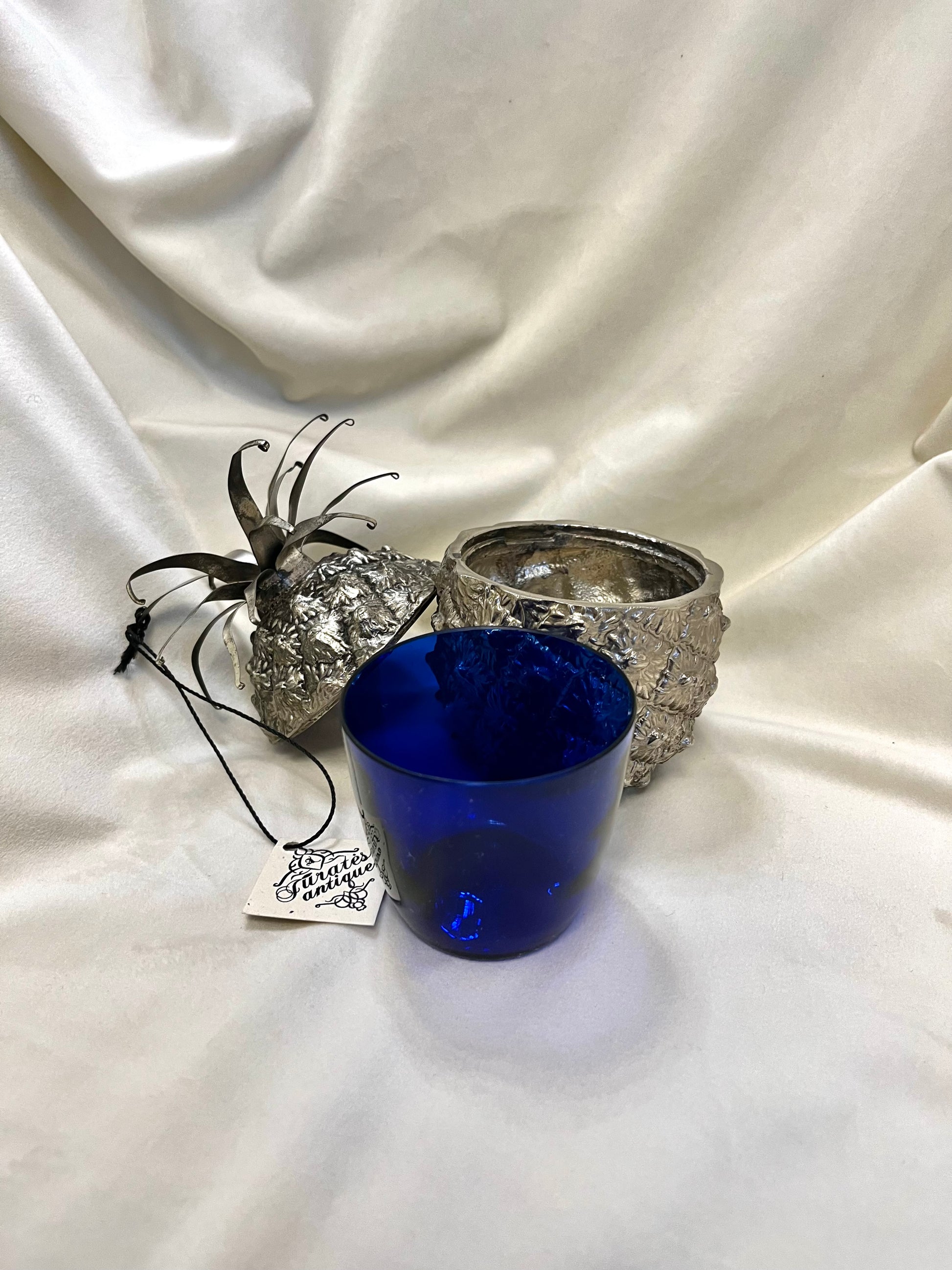 Itin elegantiška, XX a. vidurio stiliaus sidabruota ananaso formos cukrinė dėžutė. Pagaminta Italijoje apie 1950-uosius metus, įkvėpta legendinio Mauro Manetti ananaso dizaino. Puikios būklės – su originaliu kobalto mėlyno stiklo įdėklu, taip pat nepriekaištingai išsilaikiusiu: be nuskilimų ar įtrūkimų.Išskirtinis kolekcinis interjero akcentas, derinantis vintažinę eleganciją, prabangą ir itališką dizaino estetiką.