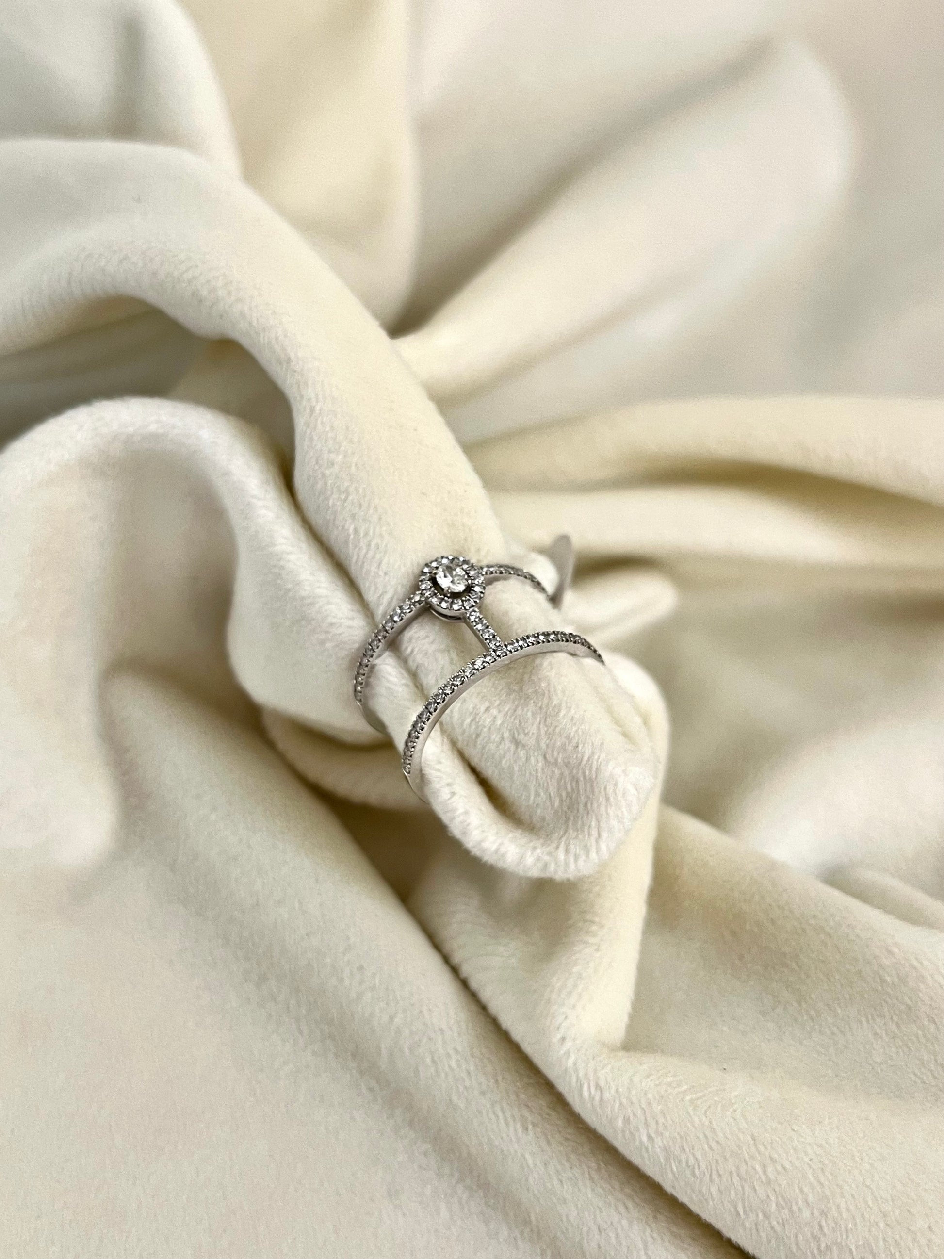 Glam’Azone baltojo aukso žiedas su dviem eilėmis deimantų žaidžia kontrastais.Atvira, ažūrinė konstrukcija iš 18 karatų baltojo aukso, Centre – ovalo formos deimantas, apsuptas smulkesnių deimantų vainiku. Šioje dviejų eilių pavé versijoje Glam’Azone žiedas derina laiko nepavaldžią eleganciją ir drąsą. Tai jausmingas ir spindintis deimantinis papuošalas, išsiskiriantis unikaliu dizainu, kruopščiai sukurtu „Messika“ meistrų.Sekdamas šiuolaikinių „neo“ papuošalų tendencijomis, šis prabangus moterų žiedas patiks šiuolaikinei moteriai, ieškančiai originalumo ir lengvumo.Spindintis baltasis auksas pabrėžia deimantų tyrumą ir išryškina jų nuostabų žvilgesį.