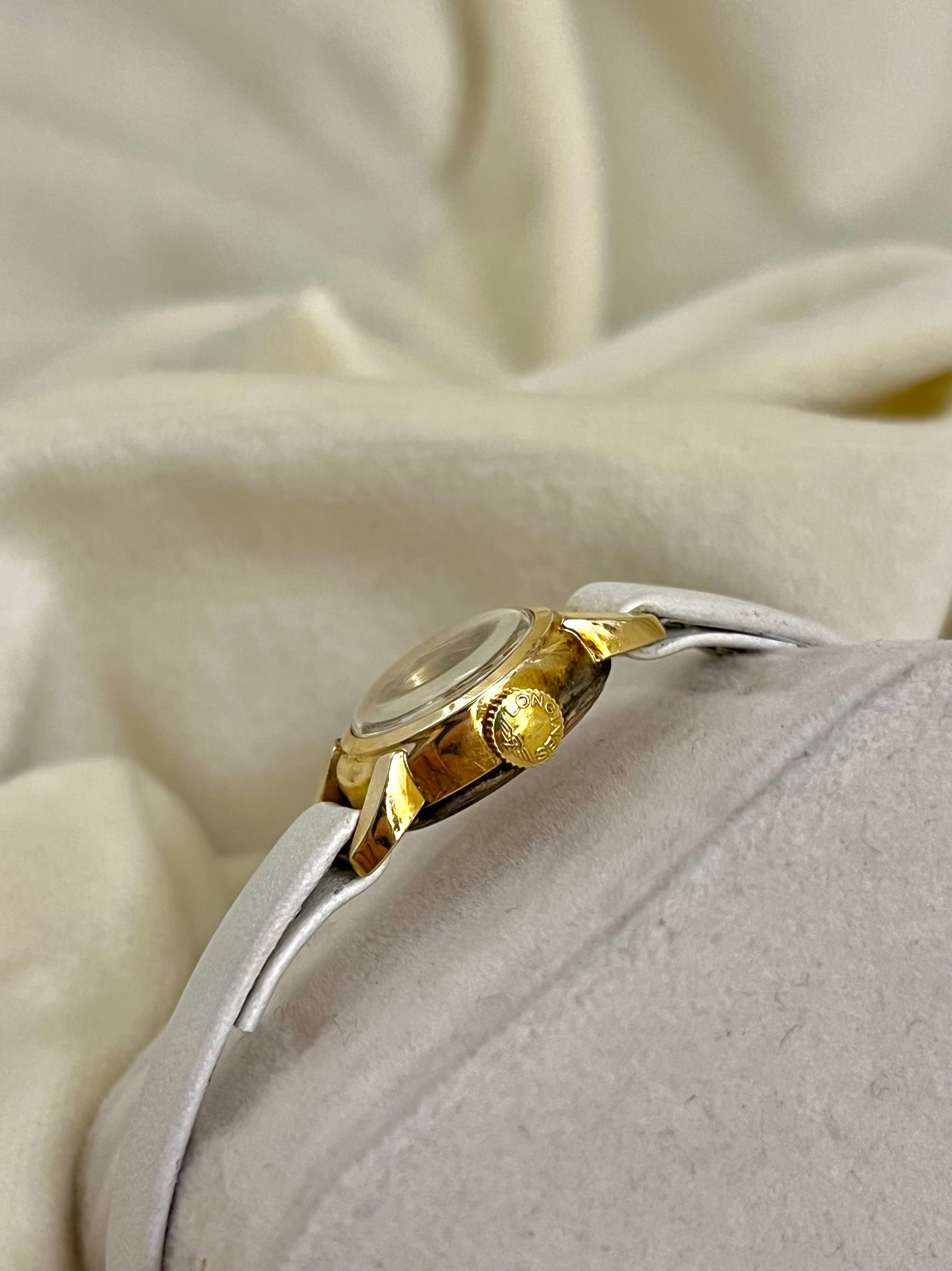 Laikrodis turi auksu dengtą korpusą, švelniai blizgantį šviesų ciferblatą, minimalistines valandų žymes ir originalų mechaninį ėjimą, kuris vis dar veikia tiksliai ir patikimai.