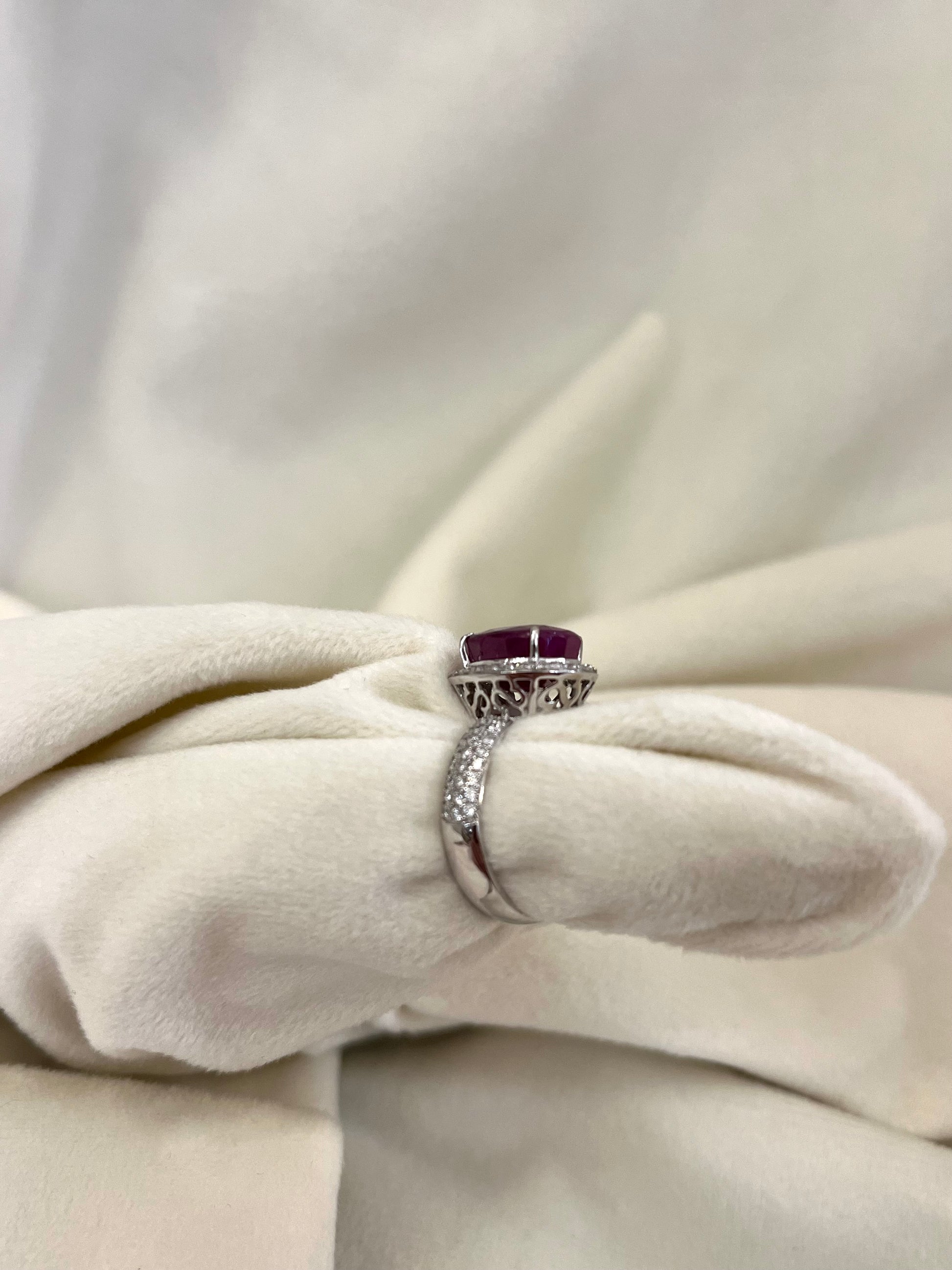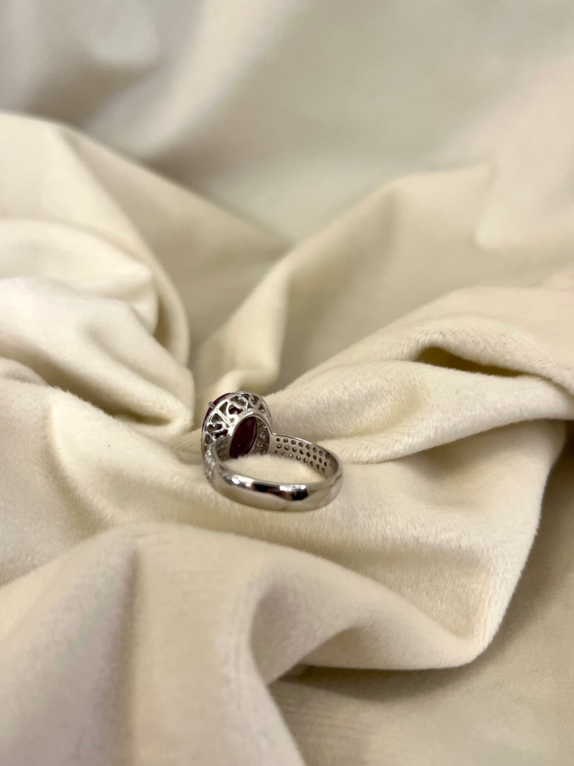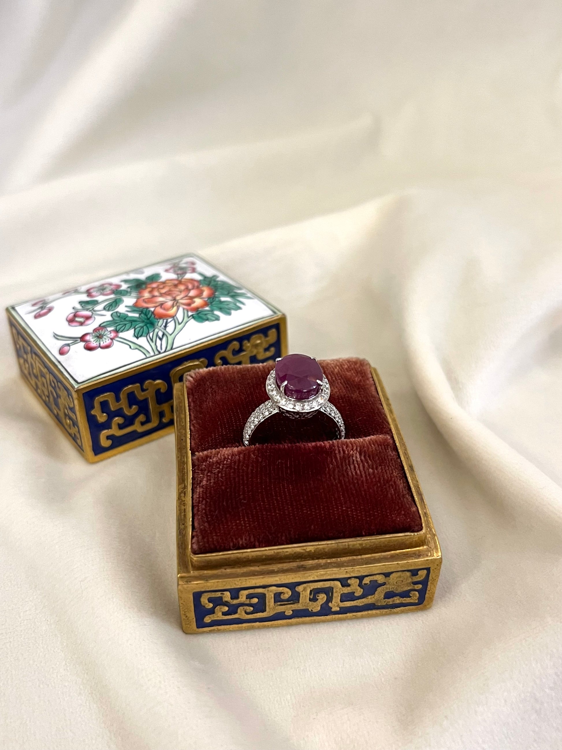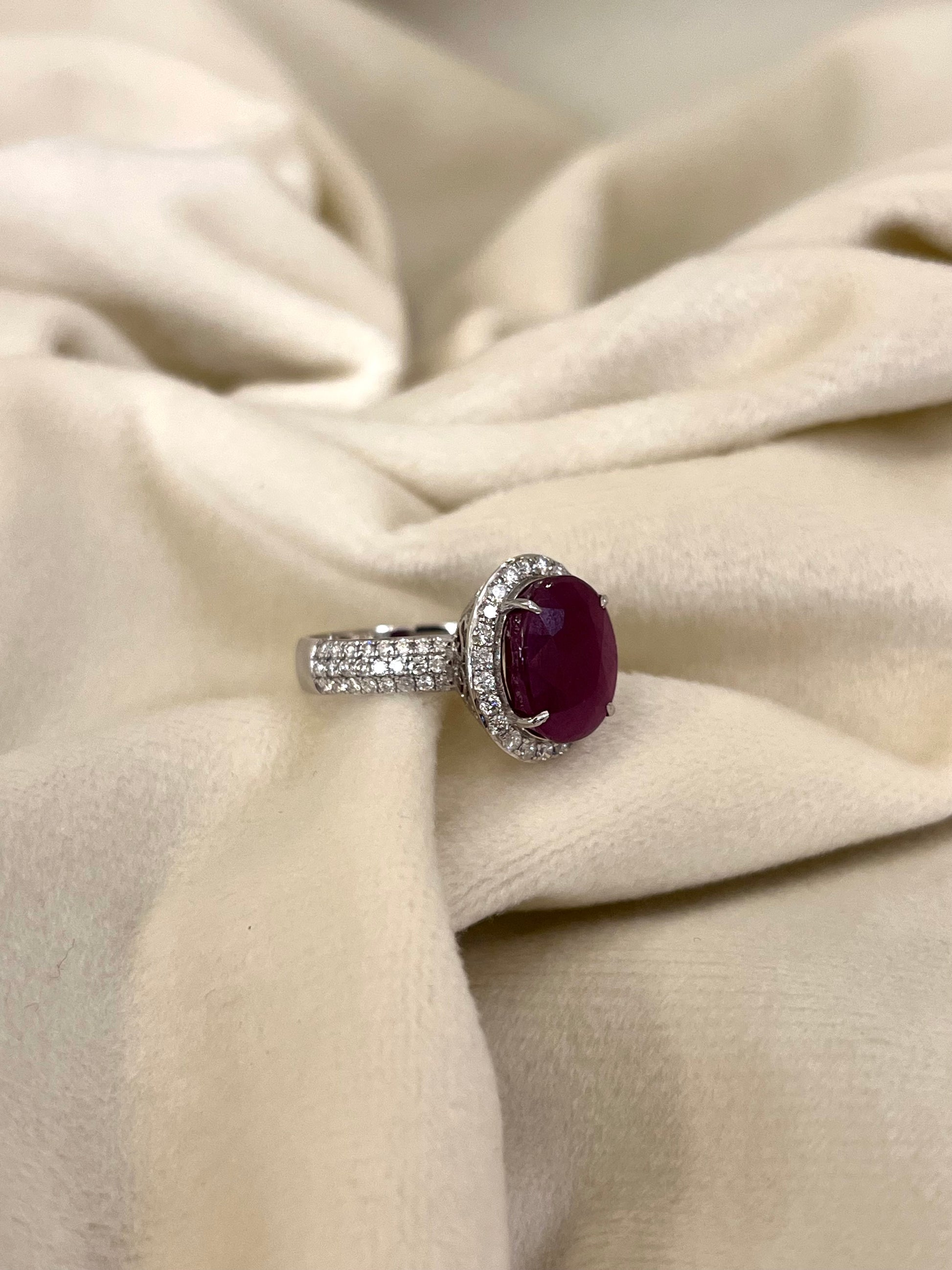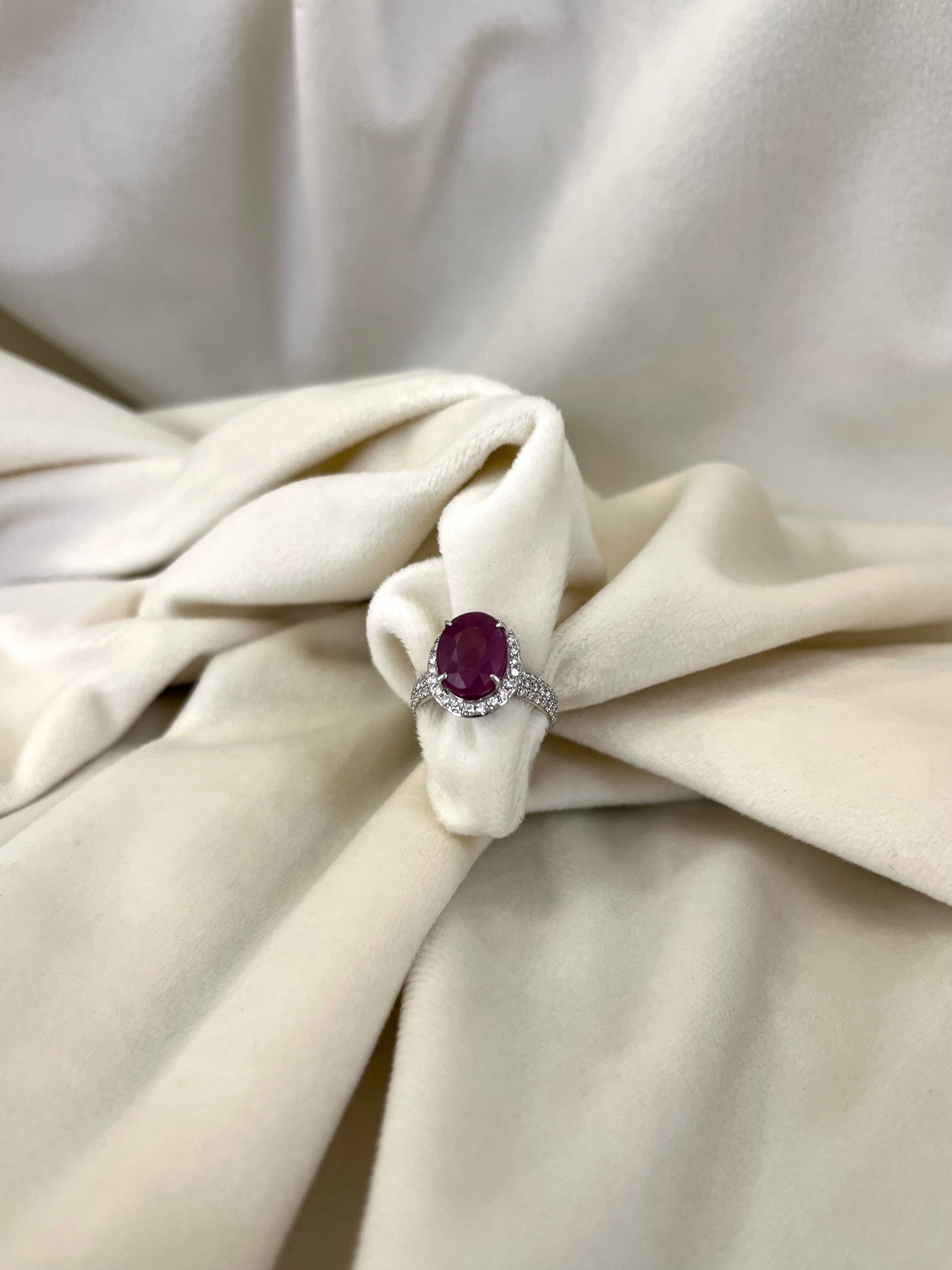 Išskirtinio grožio žiedas, pagamintas iš 14 karatų balto aukso, puoštas įspūdingu ovalios formos 5.91 ct rubinu – vienu brangiausių ir labiausiai vertinamų akmenų pasaulyje. Rubino sodri raudona spalva simbolizuoja meilę, aistrą ir gyvybės jėgą.