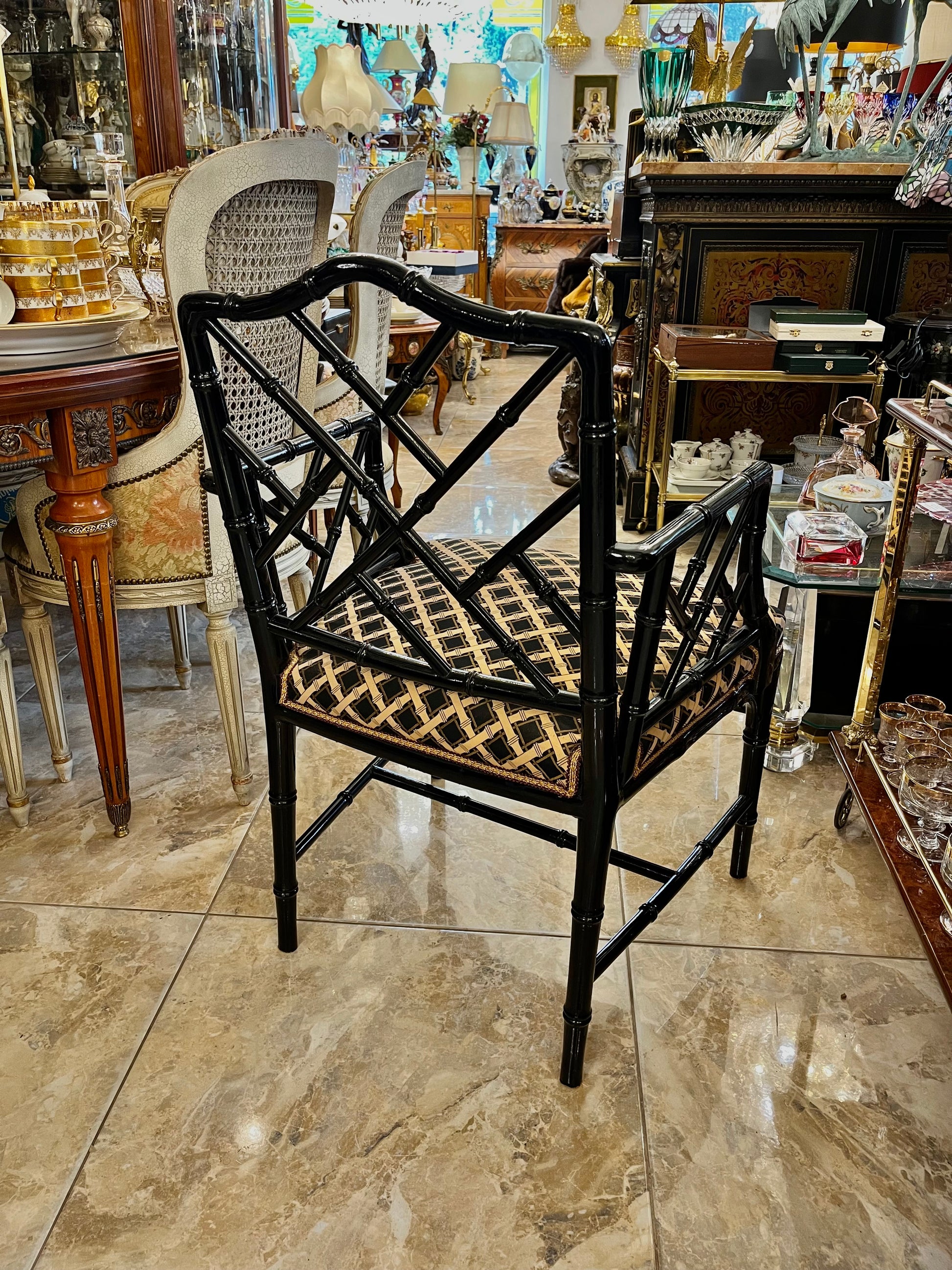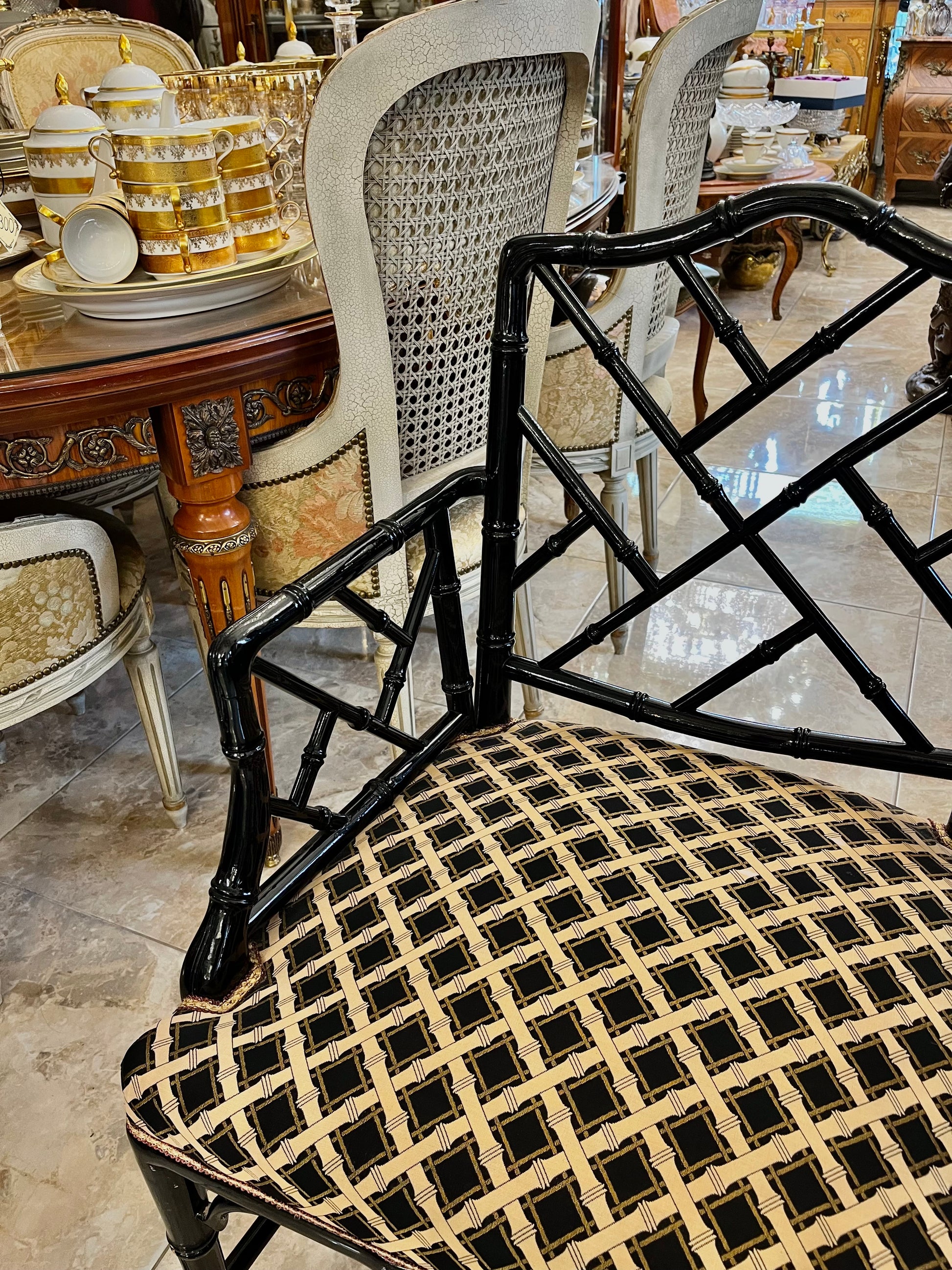 Rankų darbo medinė kėdė, kurios dizainas įkvėptas bambuko formų ir pynimo raštų. Juodas, subtiliai lakuotas karkasas bei autentiška spyruoklinė minkštoji dalis su šiltų tonų audiniu suteikia šiam baldui tiek jaukumo, tiek prabangos.