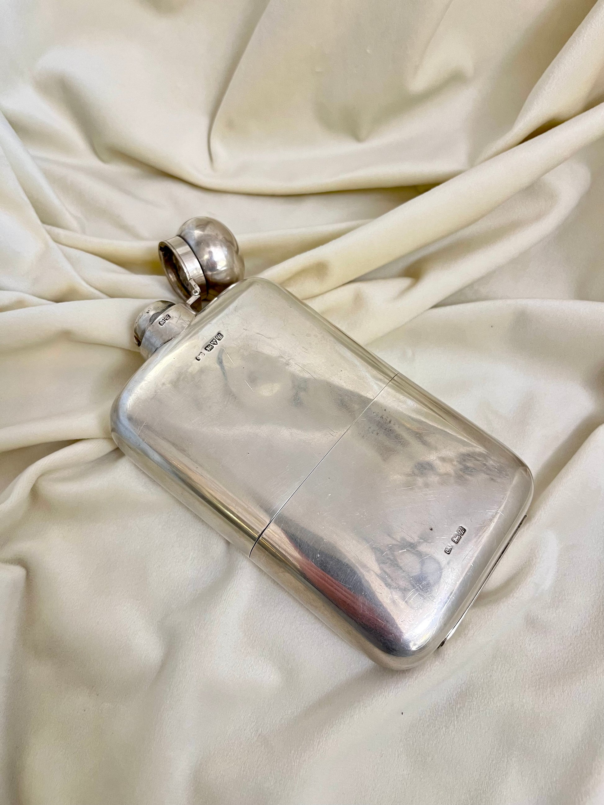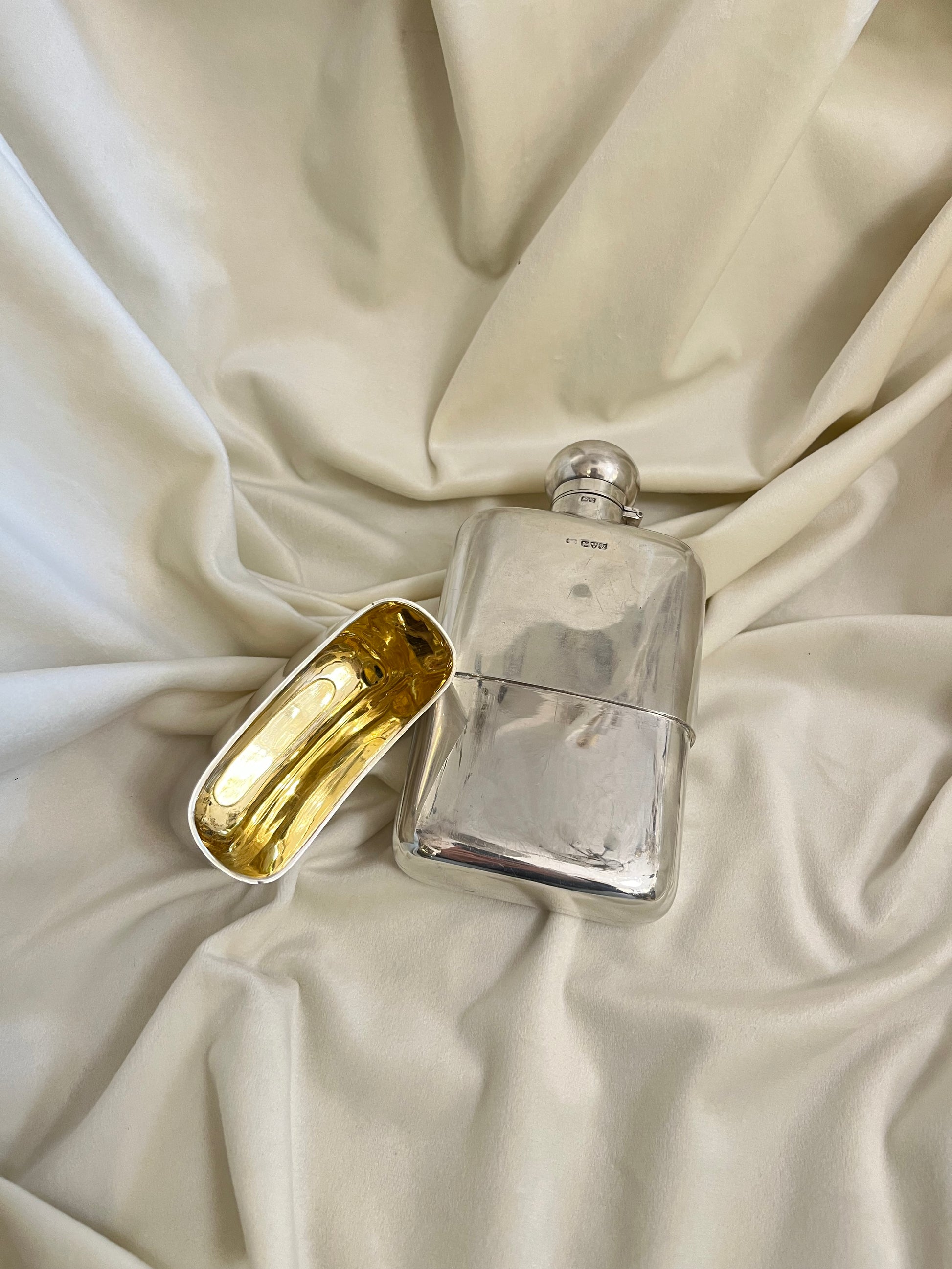 Autentiškas 1920-ųjų Chesterio meistrų darbas – išskirtinė sidabrinė gertuvė, įkūnijanti eleganciją, diskretiškumą ir tarpukario džentelmeno stilių.