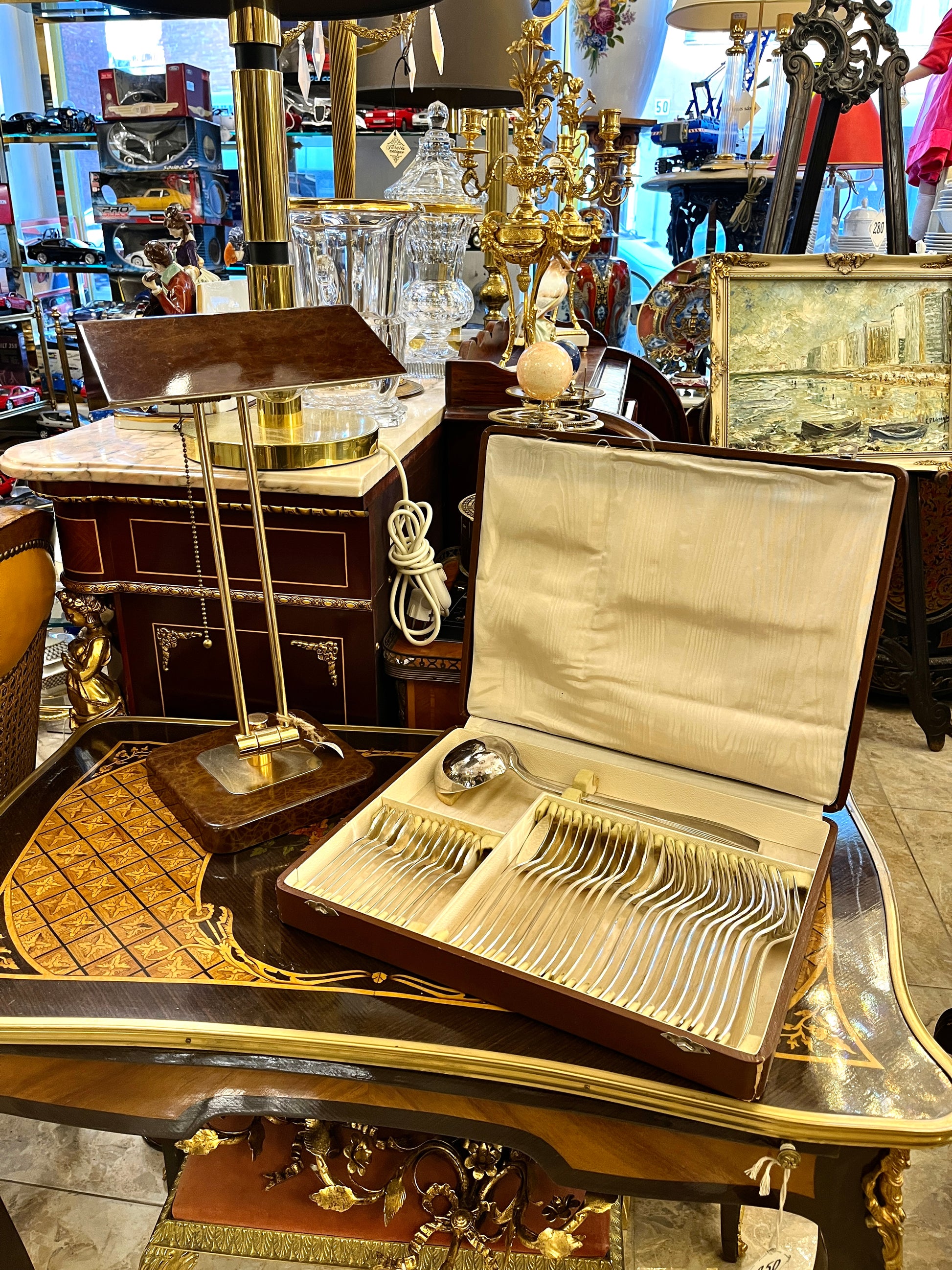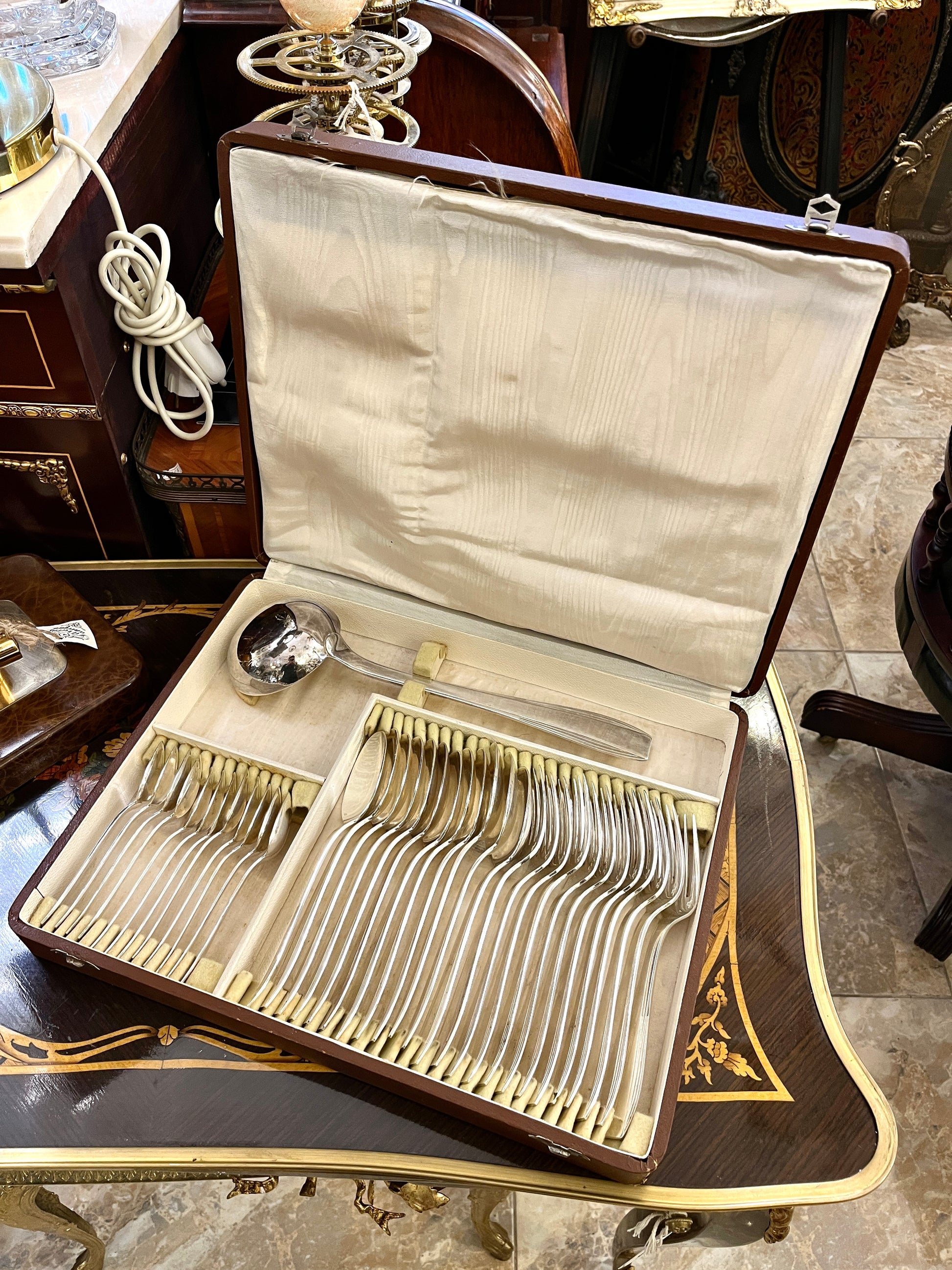 Šis Christofle manufaktūros įrankių komplektas – tai prancūziško stalo etiketo ir kokybės simbolis. 12-ai asmenų skirtas sidabru dengtas rinkinys pasižymi klasikinėmis formomis bei solidžiu svoriu, būdingu šiam prabangos ženklui.