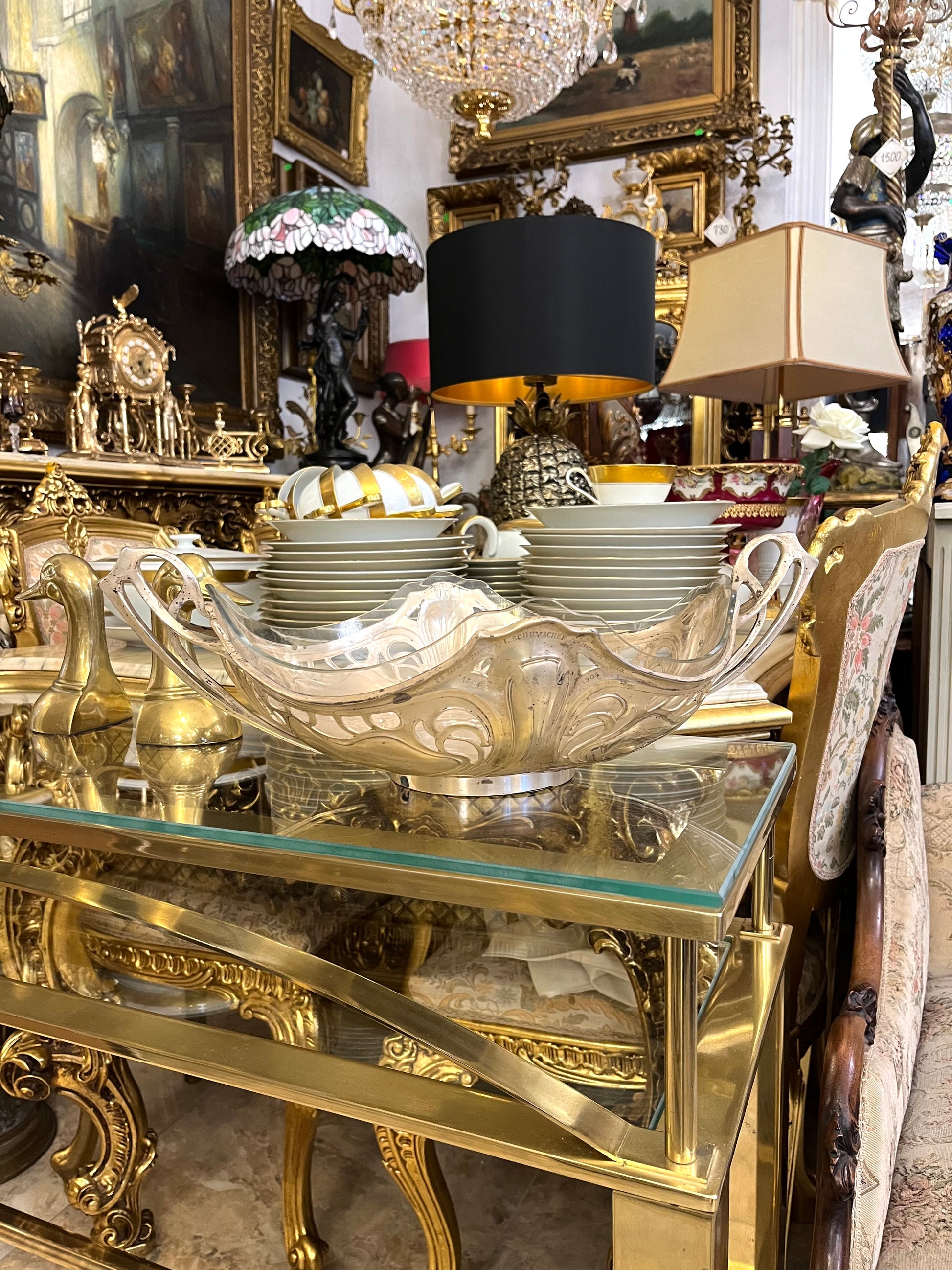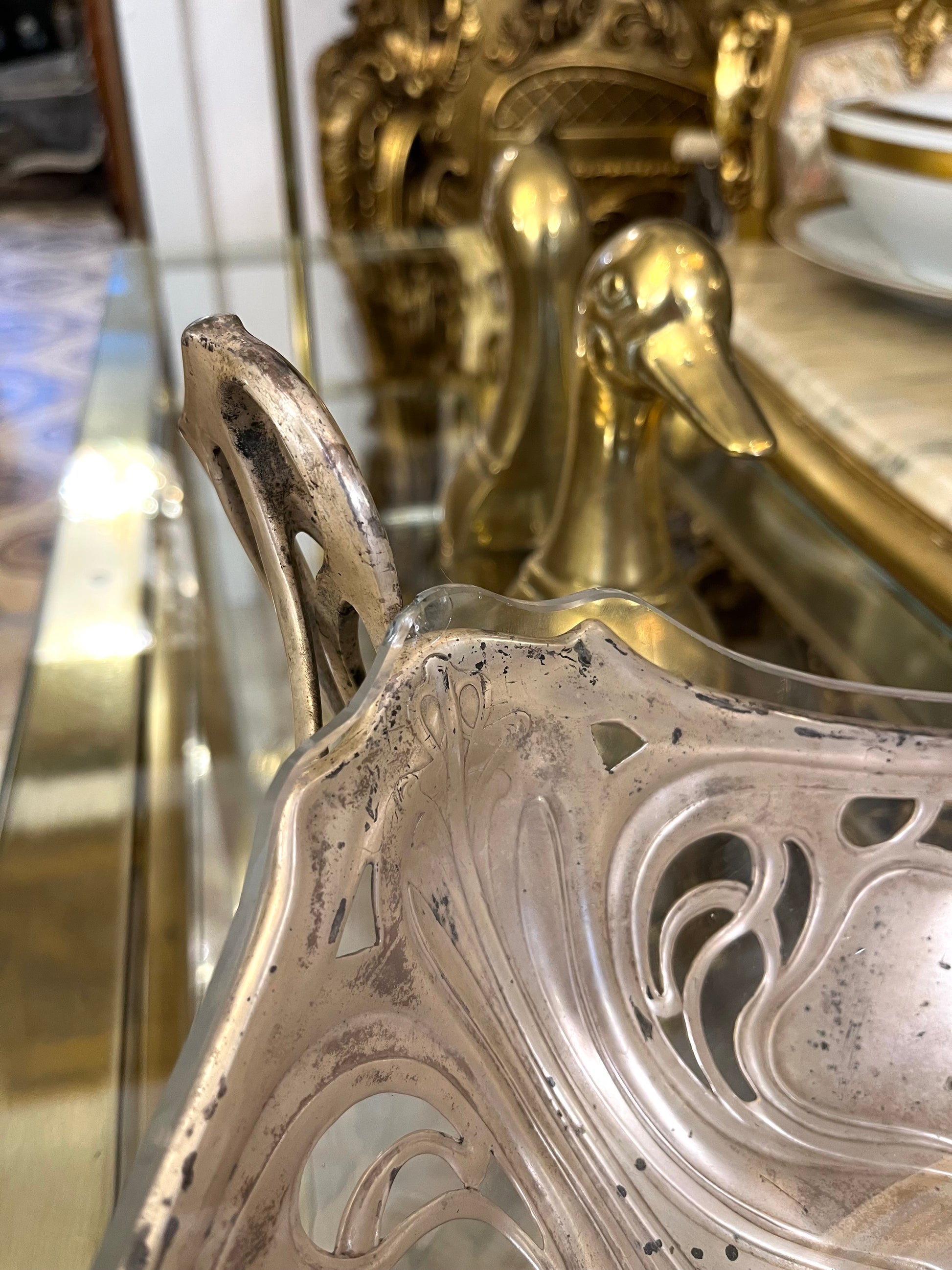 Išskirtinis sidabruotas vaisių indas su originaliu stiklo įdėklu, pagamintas 1905 metais. Elegantiška, banguota forma ir augaliniai ornamentai atspindi Art Nouveau laikotarpio estetiką – laiką, kai ypatingas dėmesys buvo skiriamas detalėms ir meistrystei.