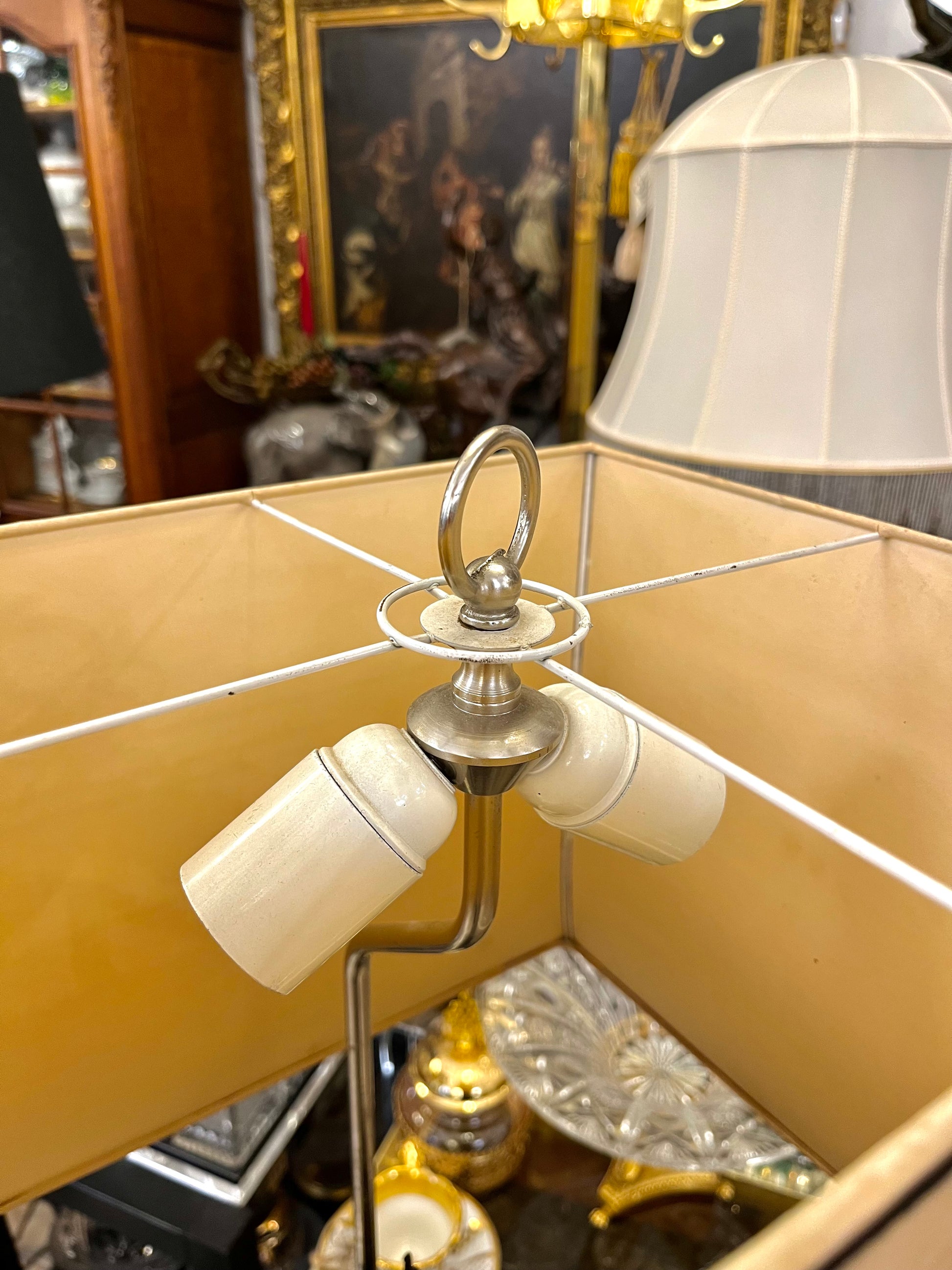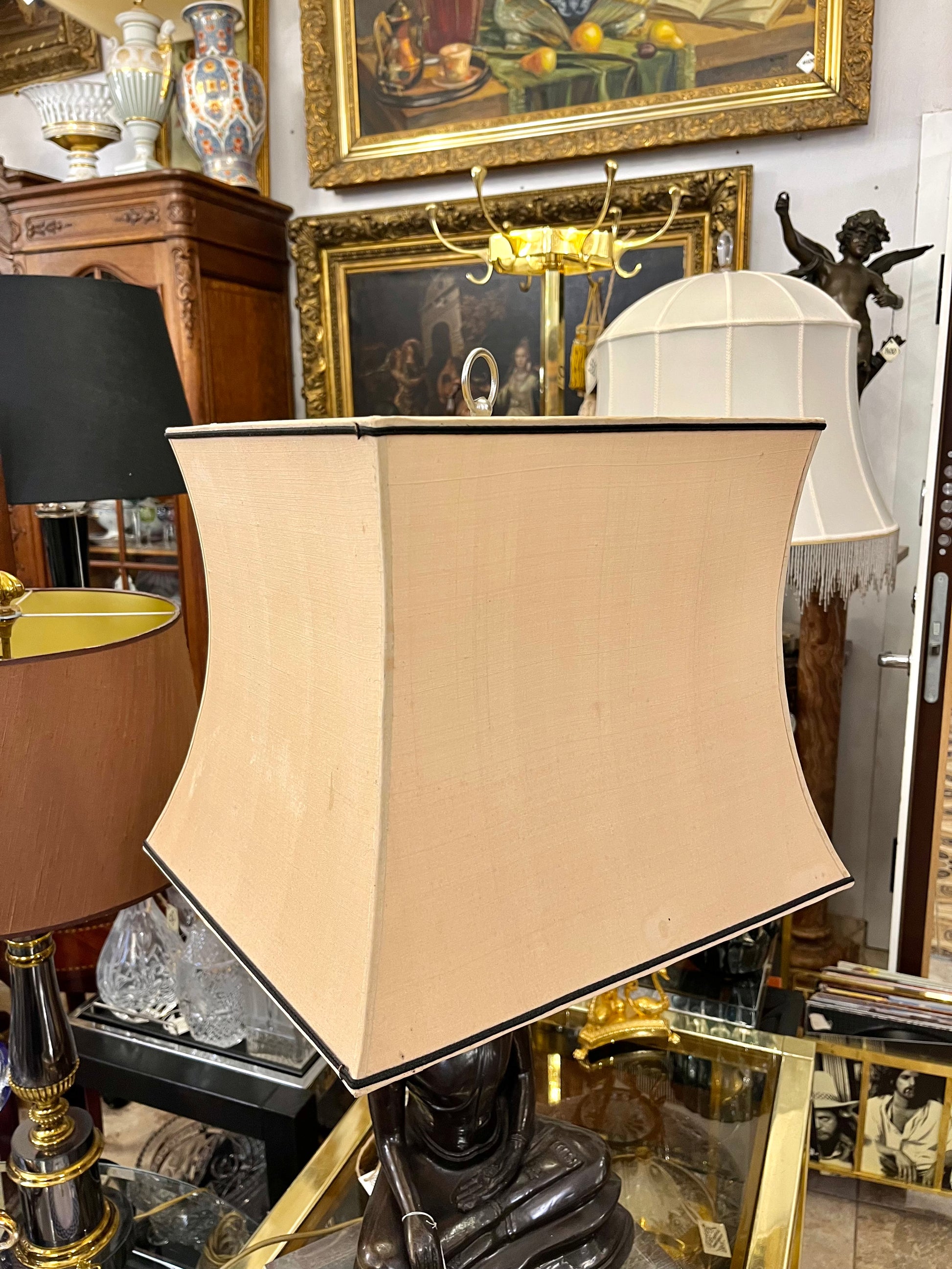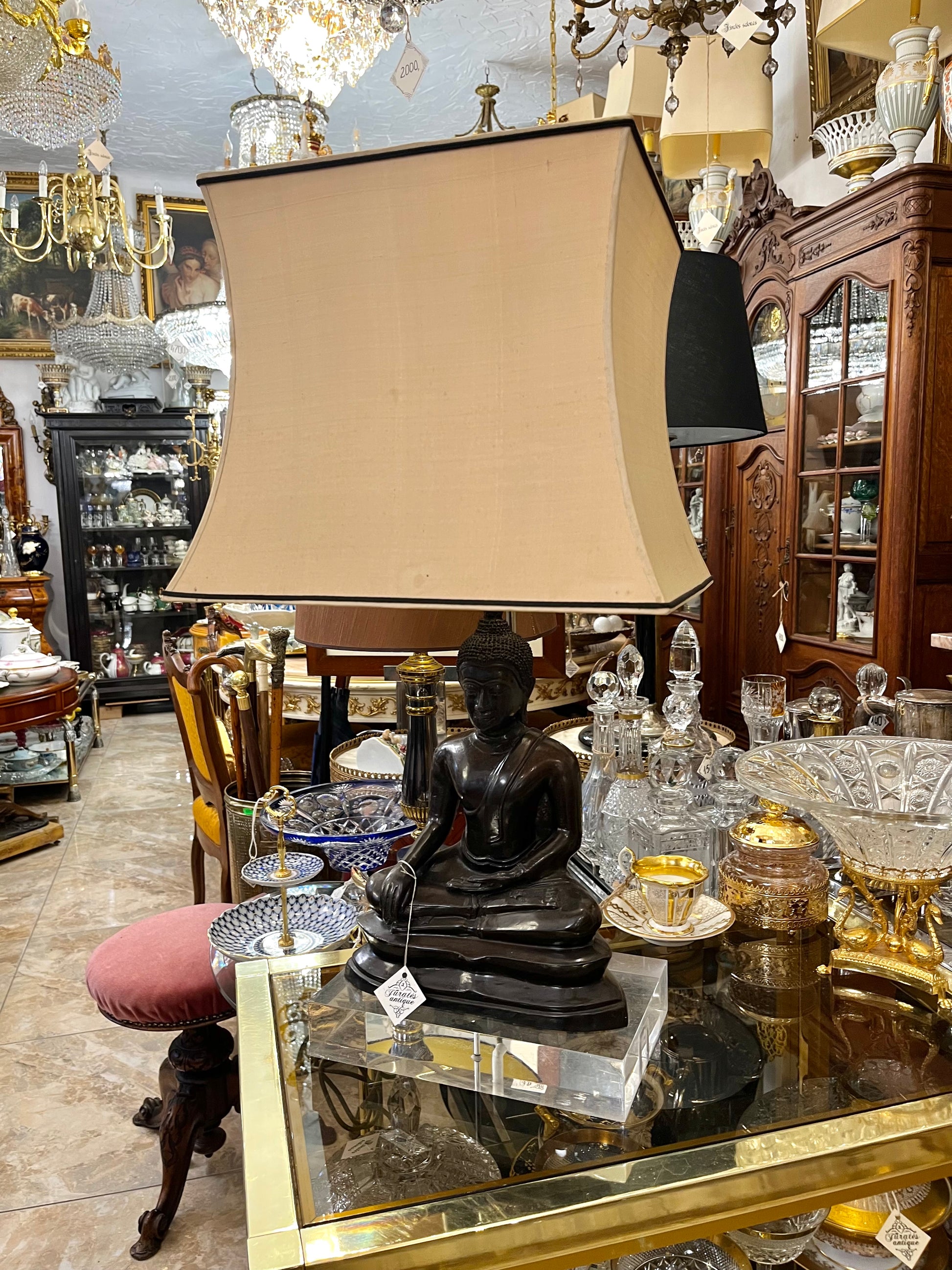 Masyvus stalinis šviestuvas su bronzine budos figūra, lucito pagrindu ir medžiaginiu gaubtu. Šviestuvo aukštis reguliuojamas.