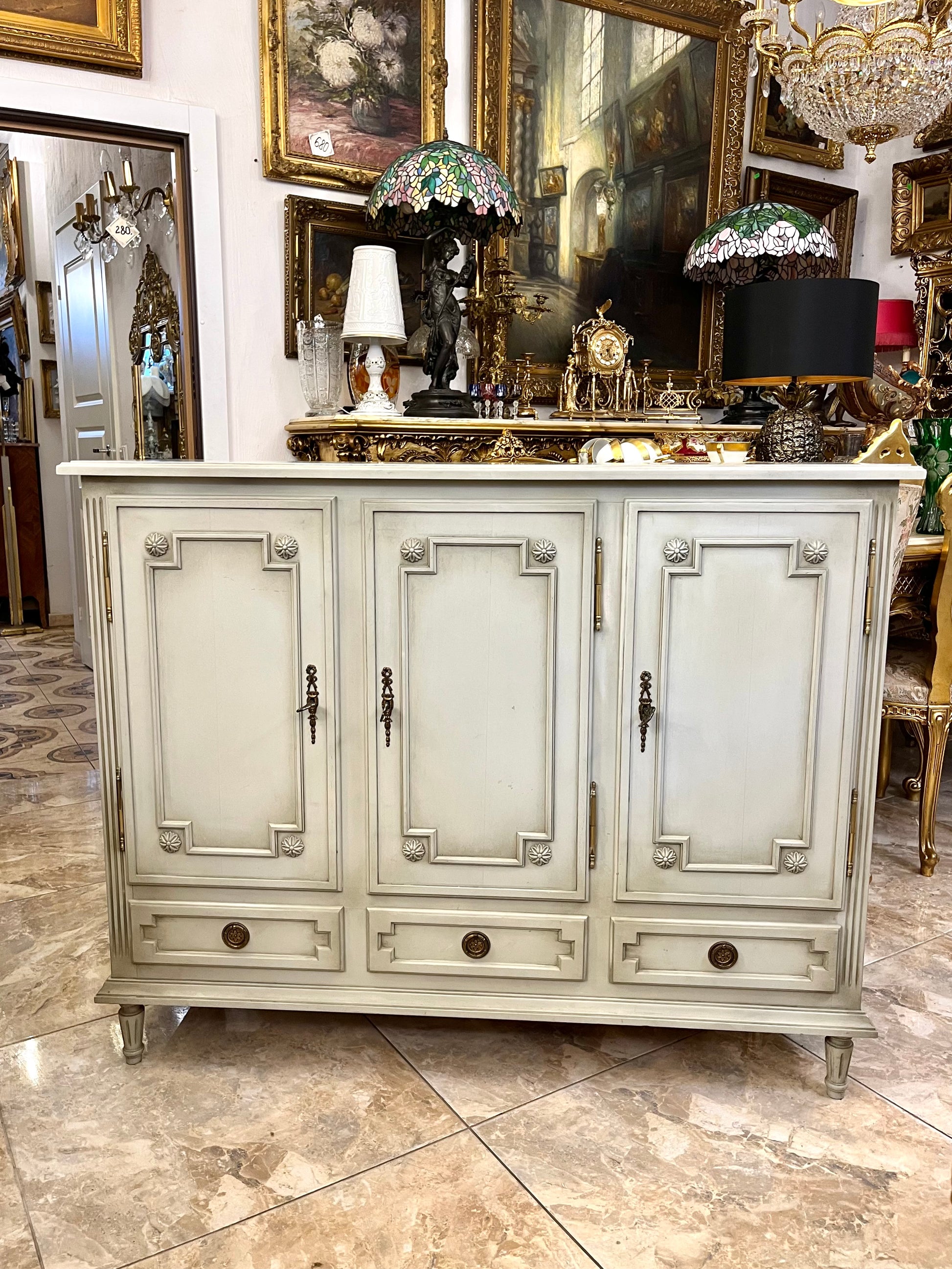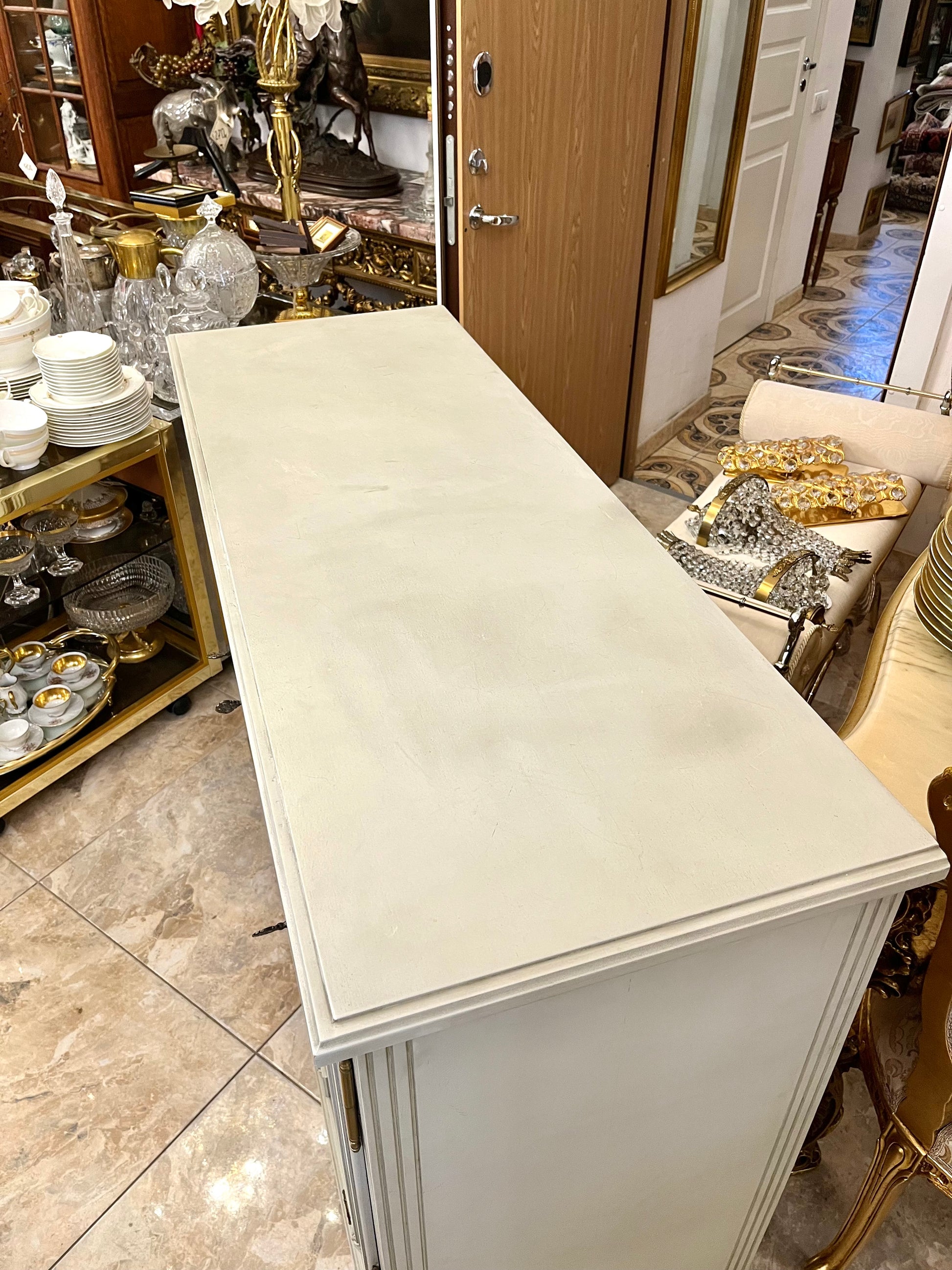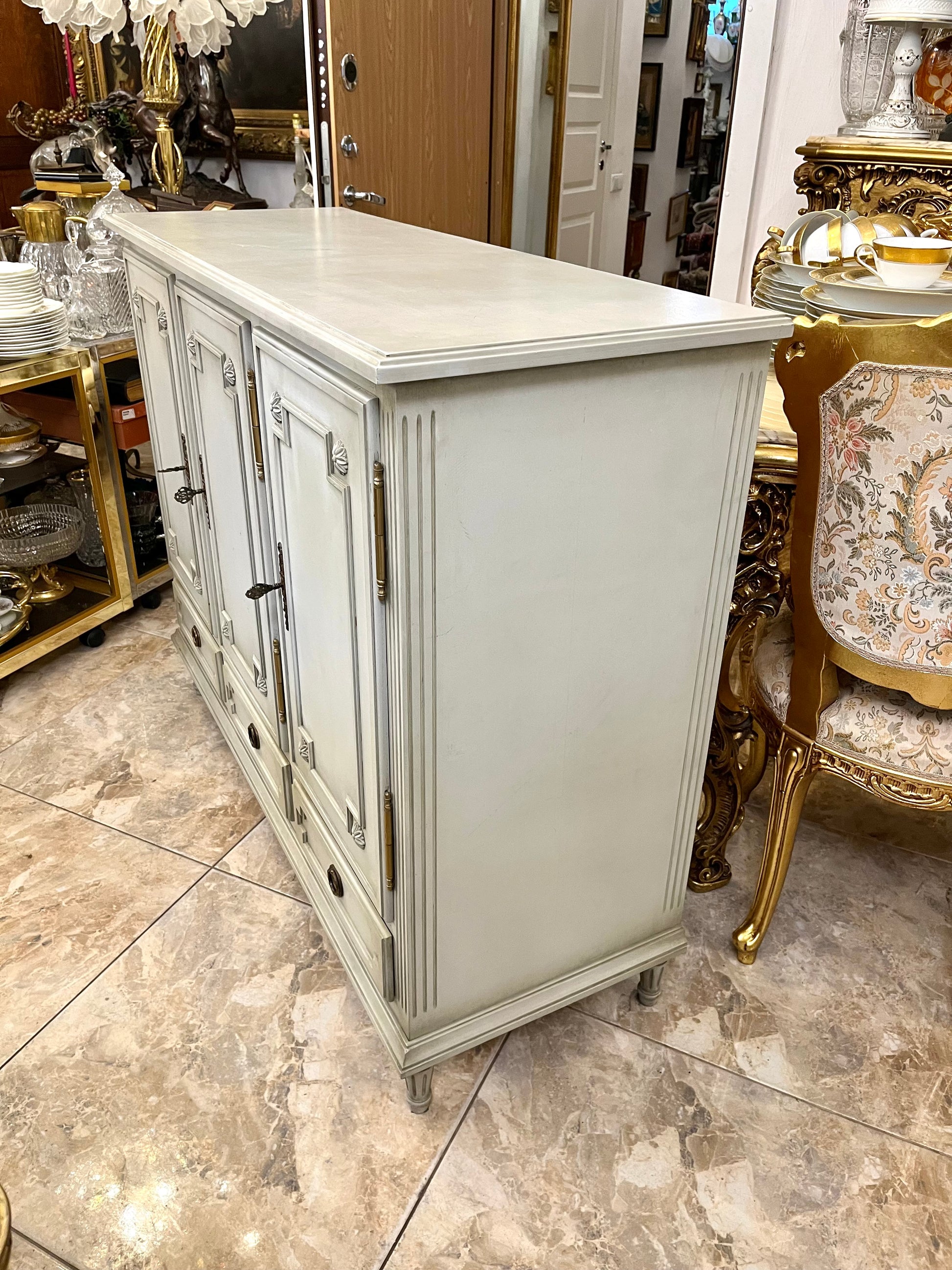 Elegantiška klasikinio stiliaus komoda su trimis stalčiais ir trimis rakinamomis durelėmis, išsiskirianti subtiliomis proporcijomis ir autentiška žalvario furnitūra. Šviesios spalvos apdaila suteikia baldui lengvumo ir rafinuotumo, o dekoratyviniai profiliai bei kojelės pabrėžia jo charakterį.