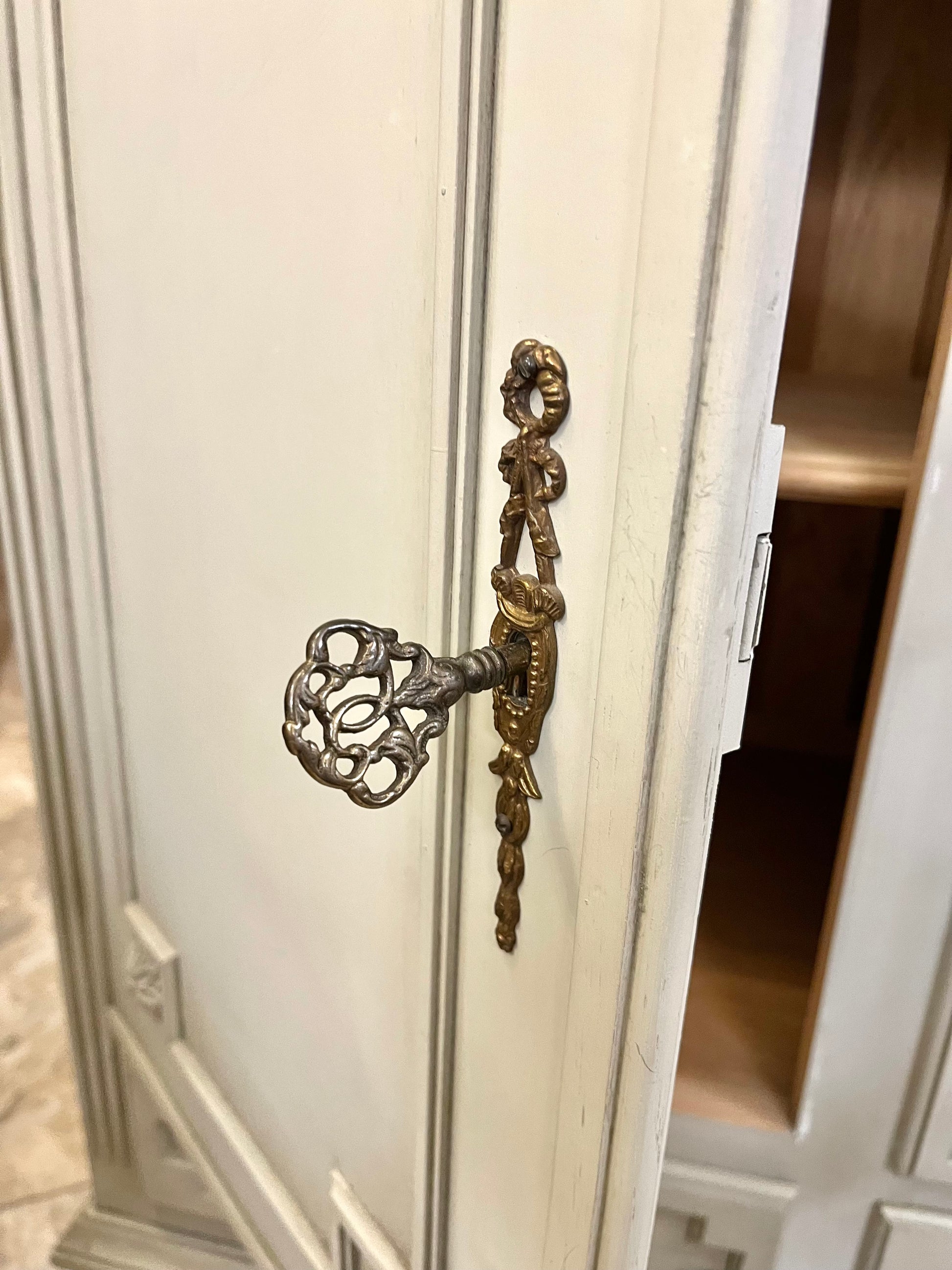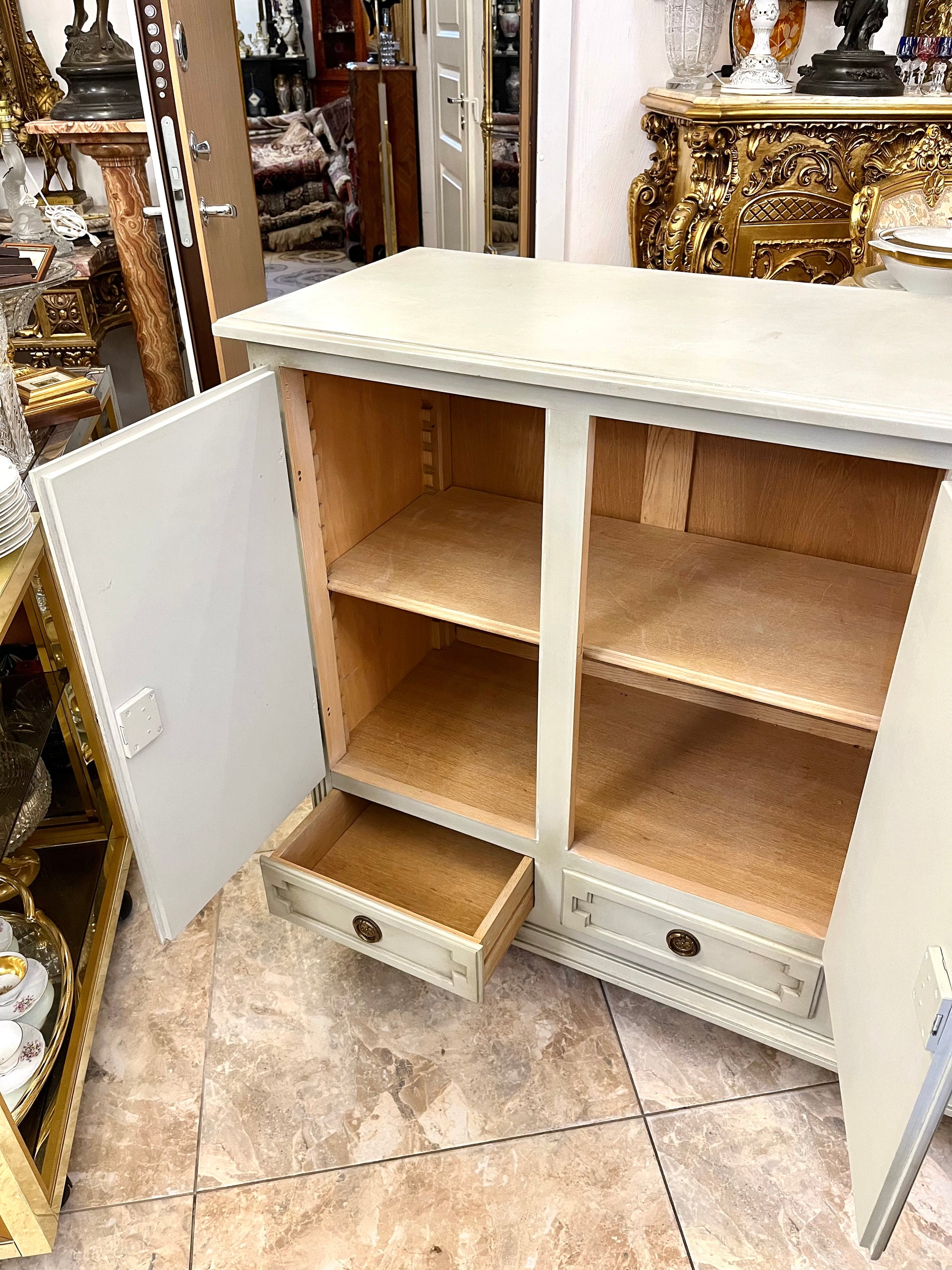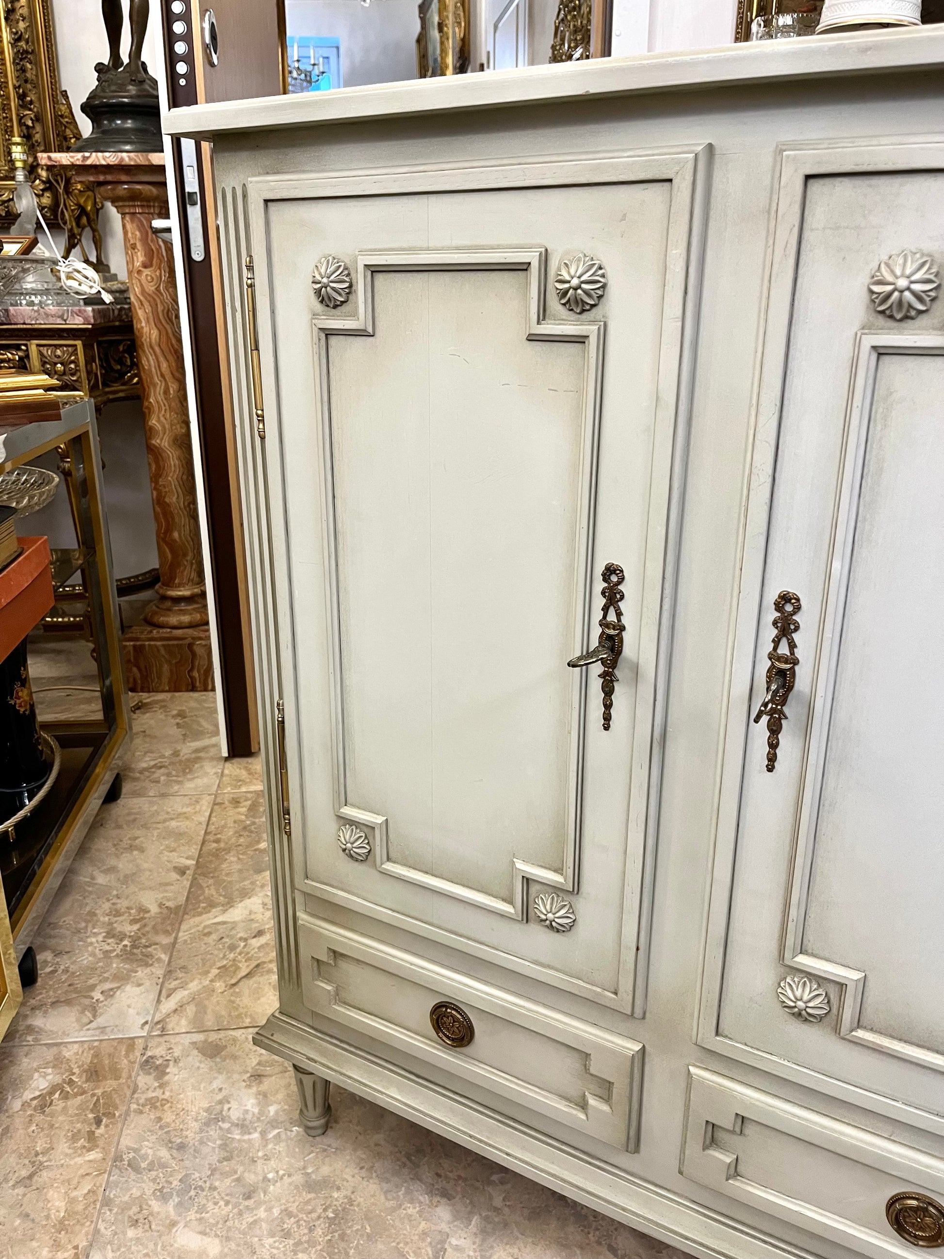Elegantiška klasikinio stiliaus komoda su trimis stalčiais ir trimis rakinamomis durelėmis, išsiskirianti subtiliomis proporcijomis ir autentiška žalvario furnitūra. Šviesios spalvos apdaila suteikia baldui lengvumo ir rafinuotumo, o dekoratyviniai profiliai bei kojelės pabrėžia jo charakterį.