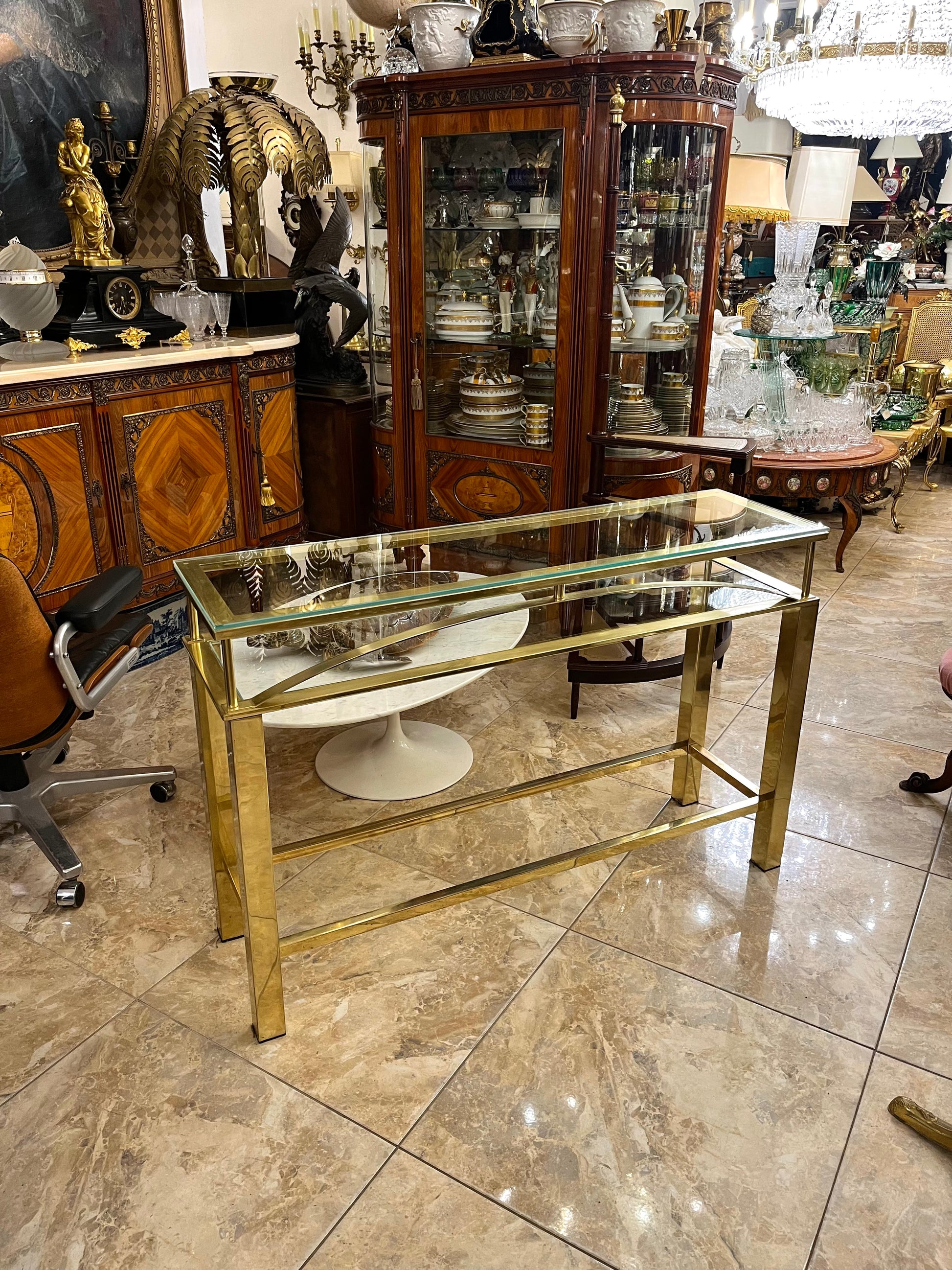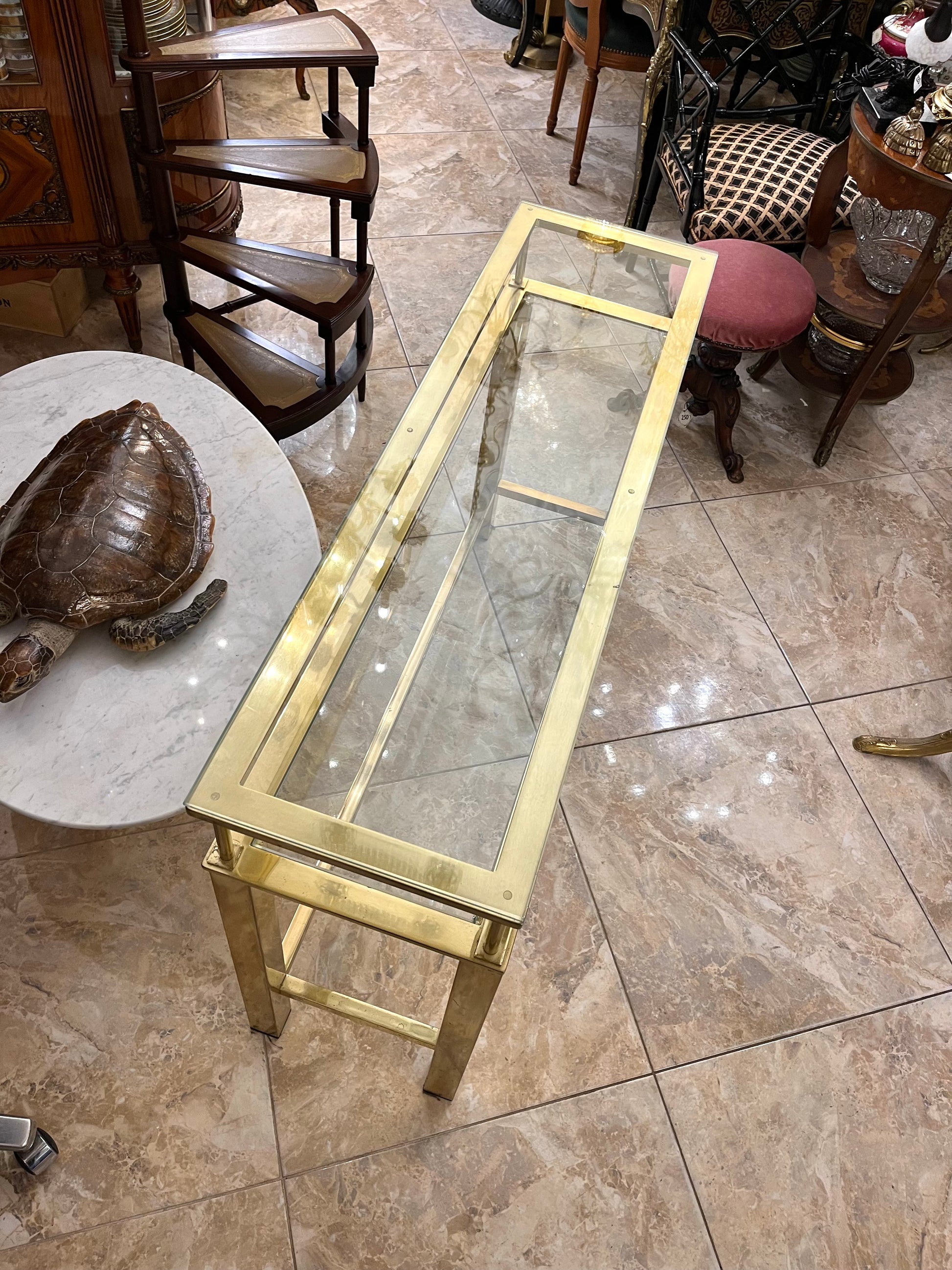 Elegantiška žalvarinė konsolė su stikliniais paviršiais, pasižyminti švaria geometrine forma ir laikui nepavaldžiu dizainu. Blizgus žalvario rėmas subtiliai dera su skaidraus stiklo plokštėmis, suteikdamas baldui lengvumo ir modernios prabangos pojūtį.
