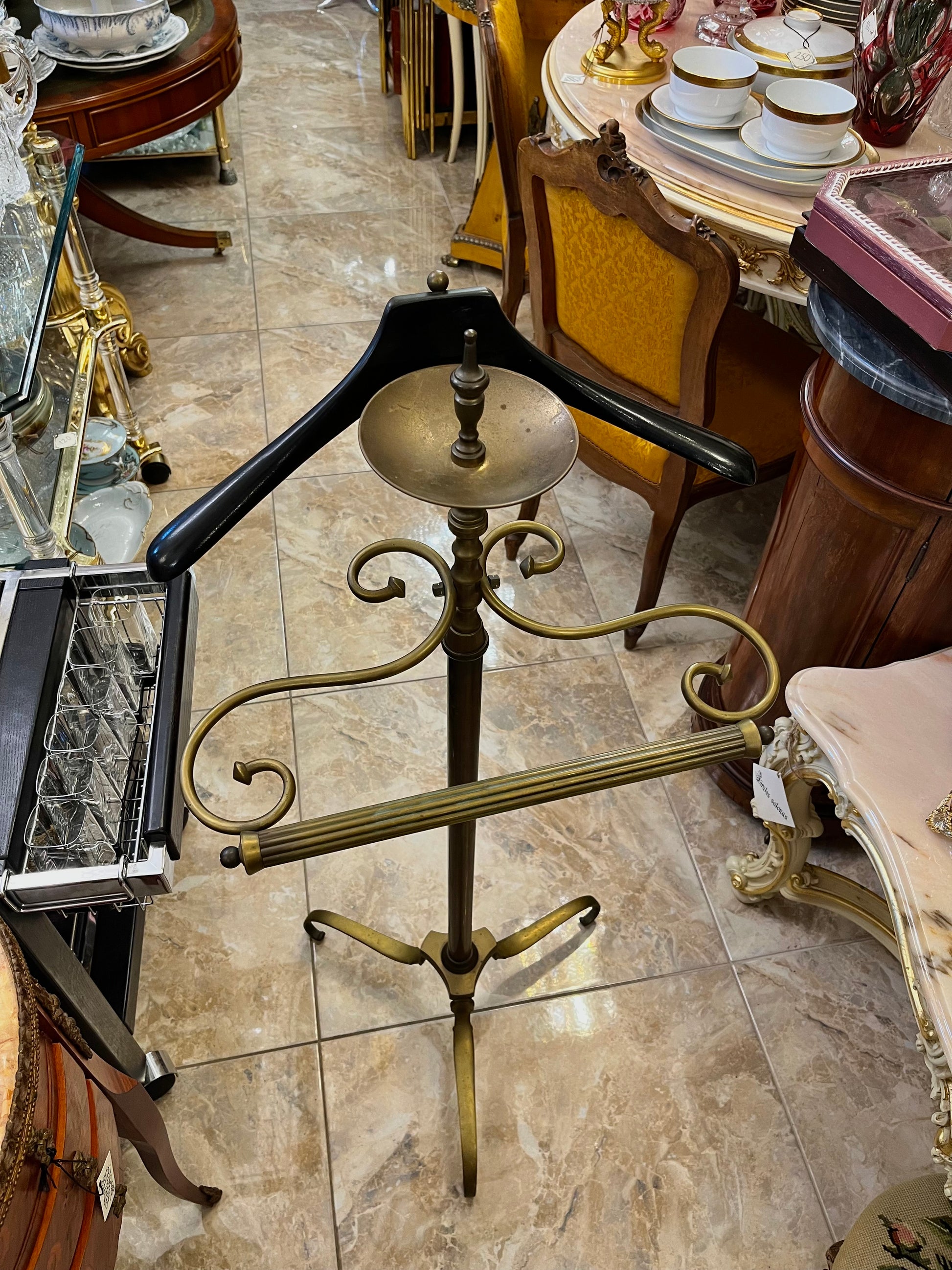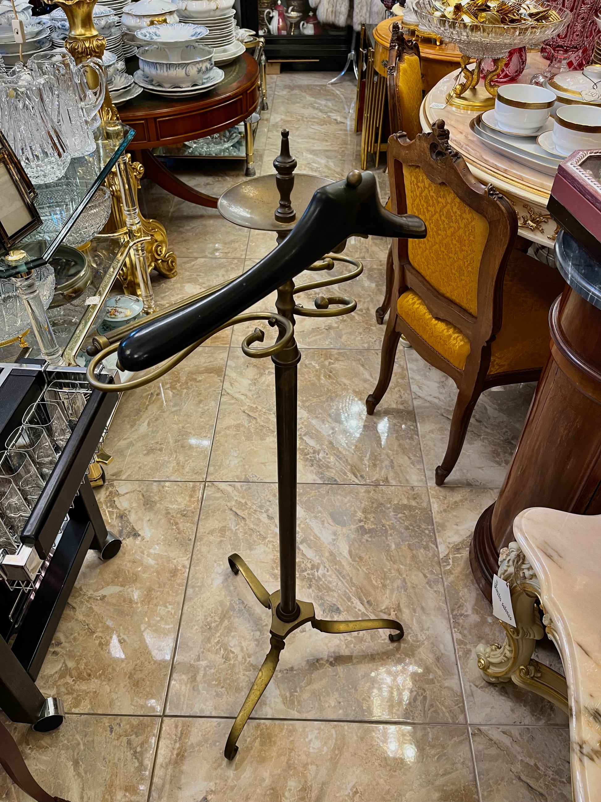 Išskirtinio dizaino žalvarinė kostiumo kabyklą – funkcionalus ir rafinuotas interjero akcentas. Klasikinės formos konstrukcija su medine pakaba švarkui ar švarkeliui bei apatiniu laikikliu kelnėms, papildyta mažu padėkliuku aksesuarams – laikrodžiui, sąsagoms ar žiedams.